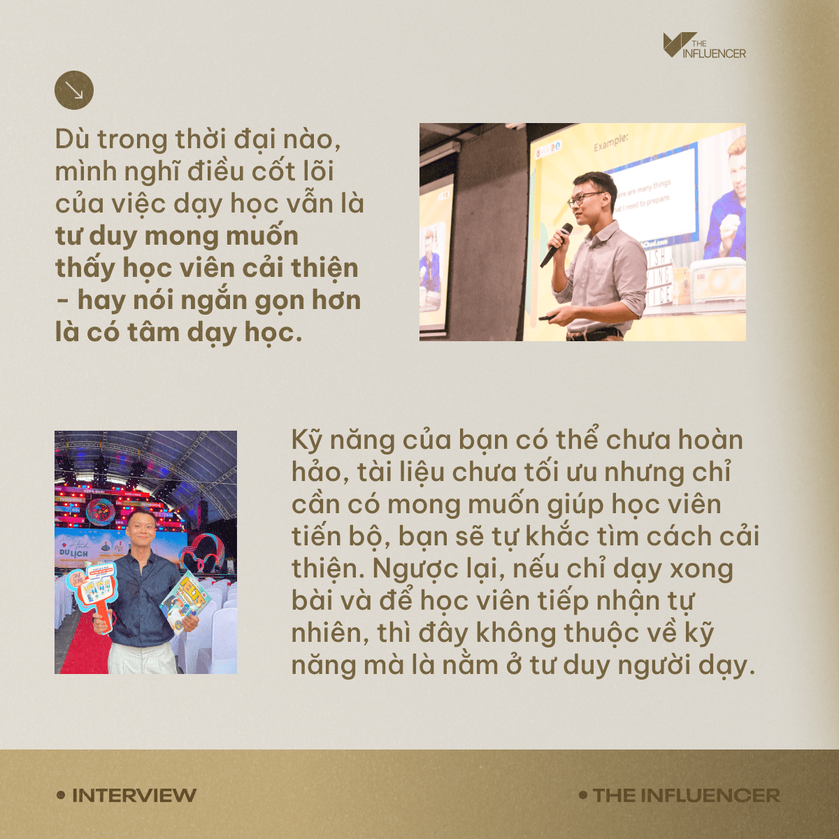Dù trong thời đại nào, mình nghĩ điều cốt lõi của việc dạy học vẫn là tư duy mong muốn thấy học viên cải thiện - hay nói ngắn gọn hơn là có tâm dạy học.