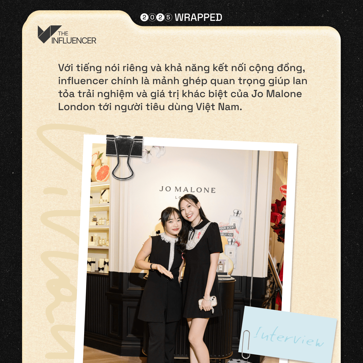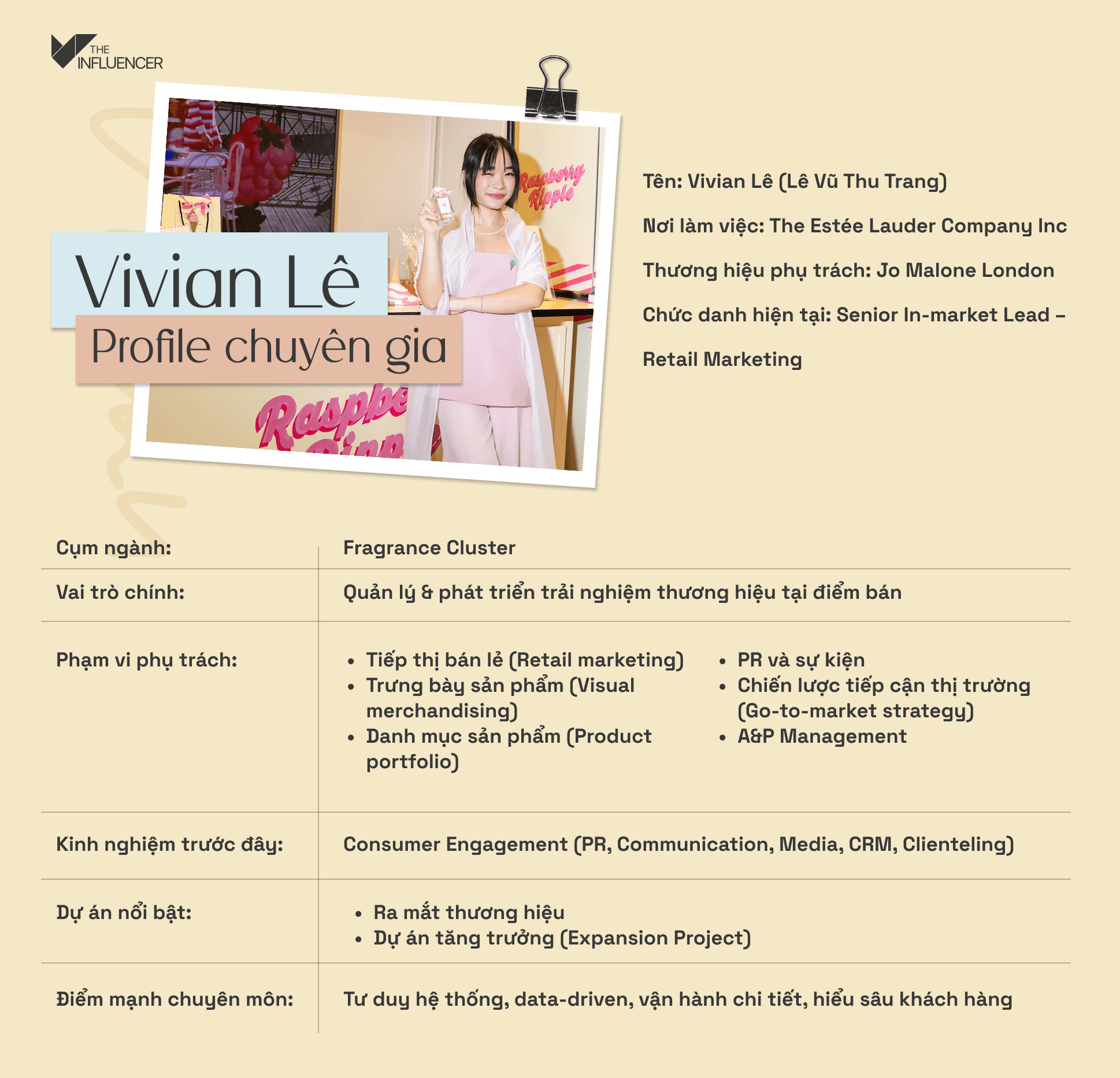 Trong bối cảnh đó, The Influencer có cuộc trò chuyện cùng Vivian Lê (Lê Vũ Thu Trang), Senior In-market Lead - Retail Marketing của Jo Malone London Việt Nam, trực thuộc The Estée Lauder Company Inc. Với kinh nghiệm trải dài từ consumer engagement đến retail marketing, Trang mang đến góc nhìn toàn diện từ phía thương hiệu. Ở vị trí người trực tiếp triển khai chiến lược, Trang không xem influencer marketing là một công cụ truyền thông riêng lẻ, mà là một phần trong hệ sinh thái xây dựng thương hiệu bền vững.