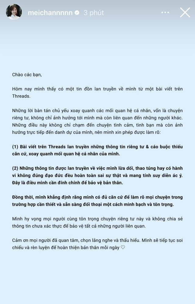 Meichan - một YouTuber, du học sinh Hàn Quốc, bị đưa vào một bài đăng lan truyền trên mạng xã hội với nhiều cáo buộc về mối quan hệ cá nhân, cách ứng xử với bạn bè cùng sự thật phía sau một số video quảng cáo khiến dư luận xôn xao. Không dừng lời trước những lập luận vô căn cứ, Meichan đã nhanh chóng lên video, nhắc đến và giải thích từng sự kiện trong bài đăng tố cáo trên Threads, từ đó nhận được rất nhiều ủng hộ từ khán giả và người hâm mộ khi cô sẵn sàng đối mặt với mọi khó khăn. Hiện nay, Meichan vẫn tiếp tục công việc sáng tạo nội dung của mình cùng content đi du học tại New Zealand được rất nhiều bạn trẻ đón nhận nhờ năng lượng tích cực và truyền động lực về cuộc sống.