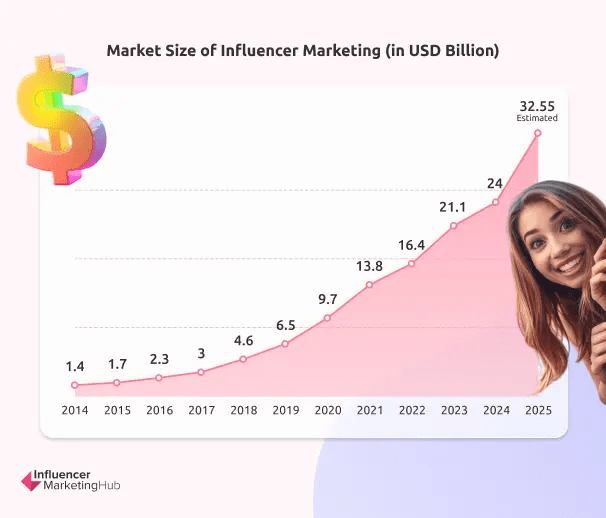 Influencer marketing tiếp tục duy trì đà tăng trưởng nhanh, với quy mô thị trường toàn cầu dự kiến đạt 32,55 tỷ USD vào năm 2025, tăng từ 24 tỷ USD năm 2024 và 1,4 tỷ USD năm 2014. Tốc độ tăng trưởng kép hằng năm (CAGR 33,11%) trong suốt một thập kỷ cho thấy influencer marketing đã vượt qua giai đoạn thử nghiệm và trở thành một cấu phần quan trọng của ngành quảng cáo.