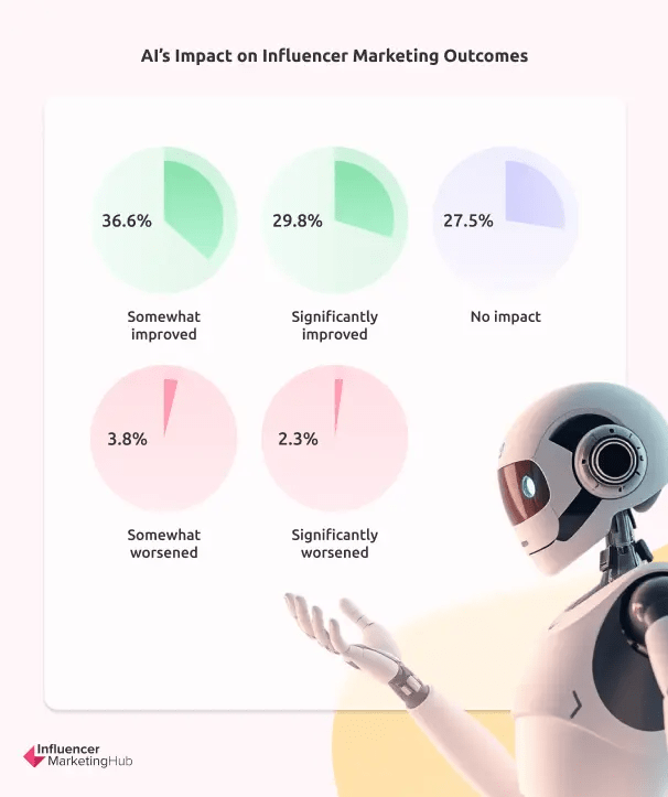 Dữ liệu cho thấy AI đã tạo ra tác động tích cực rõ ràng đối với hiệu quả influencer marketing. 66,4% người tham gia khảo sát cho biết AI giúp cải thiện kết quả chiến dịch ở mức độ nhất định hoặc đáng kể, trong khi chỉ 6,1% ghi nhận hiệu quả giảm sút. Điều này cho thấy AI đang phát huy vai trò trong việc giảm thiểu các hạn chế về quy trình, dữ liệu và hiệu suất vốn tồn tại lâu nay trong ngành.