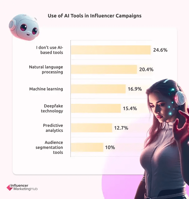 Đáng chú ý, sự xuất hiện của deepfake tools (15,4%) và phân tích dự báo (12,7%) cho thấy AI đang bước sang giai đoạn phức tạp hơn, không chỉ tự động hóa mà còn tái định nghĩa cách thương hiệu đo lường hiệu quả và tương tác với khán giả.