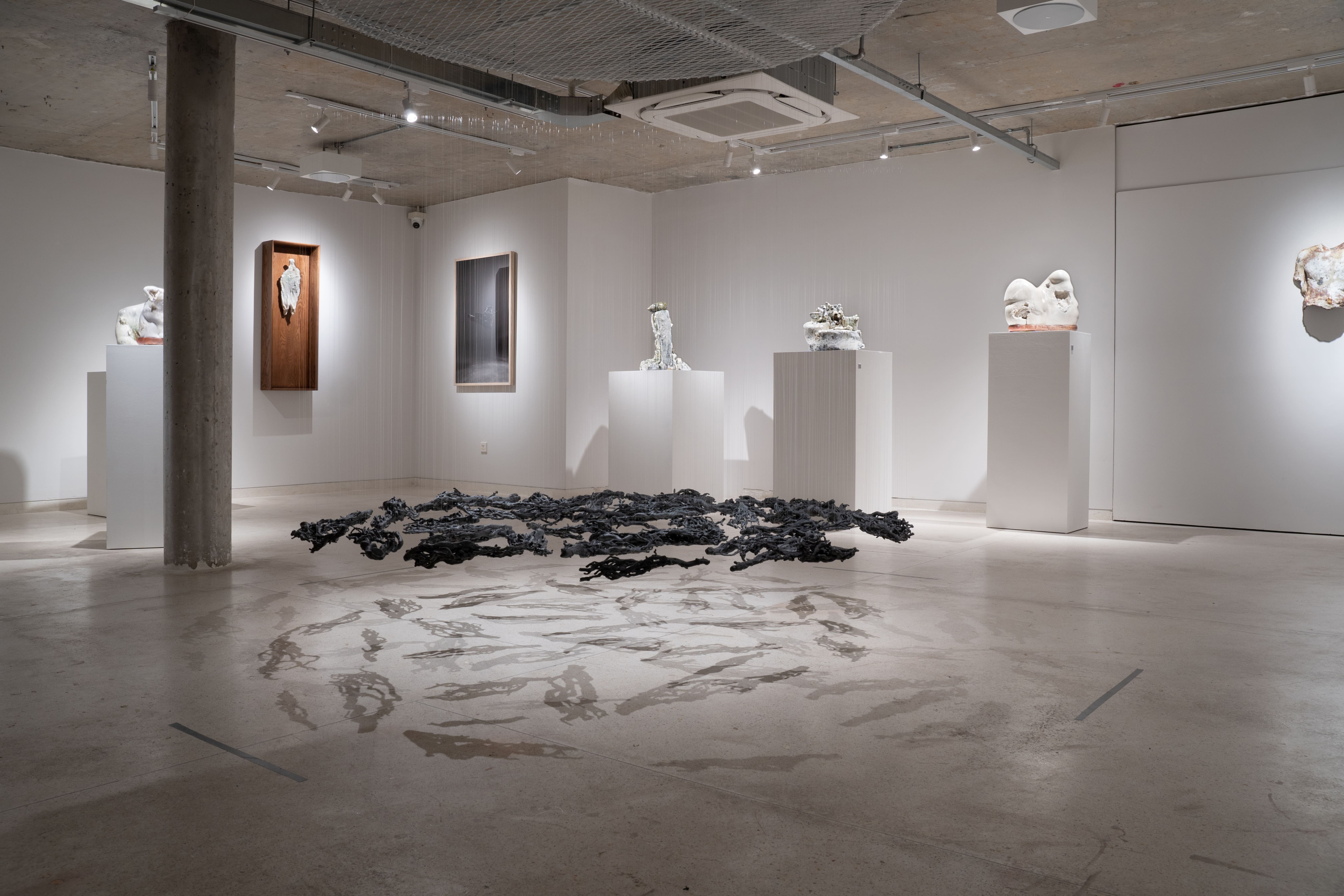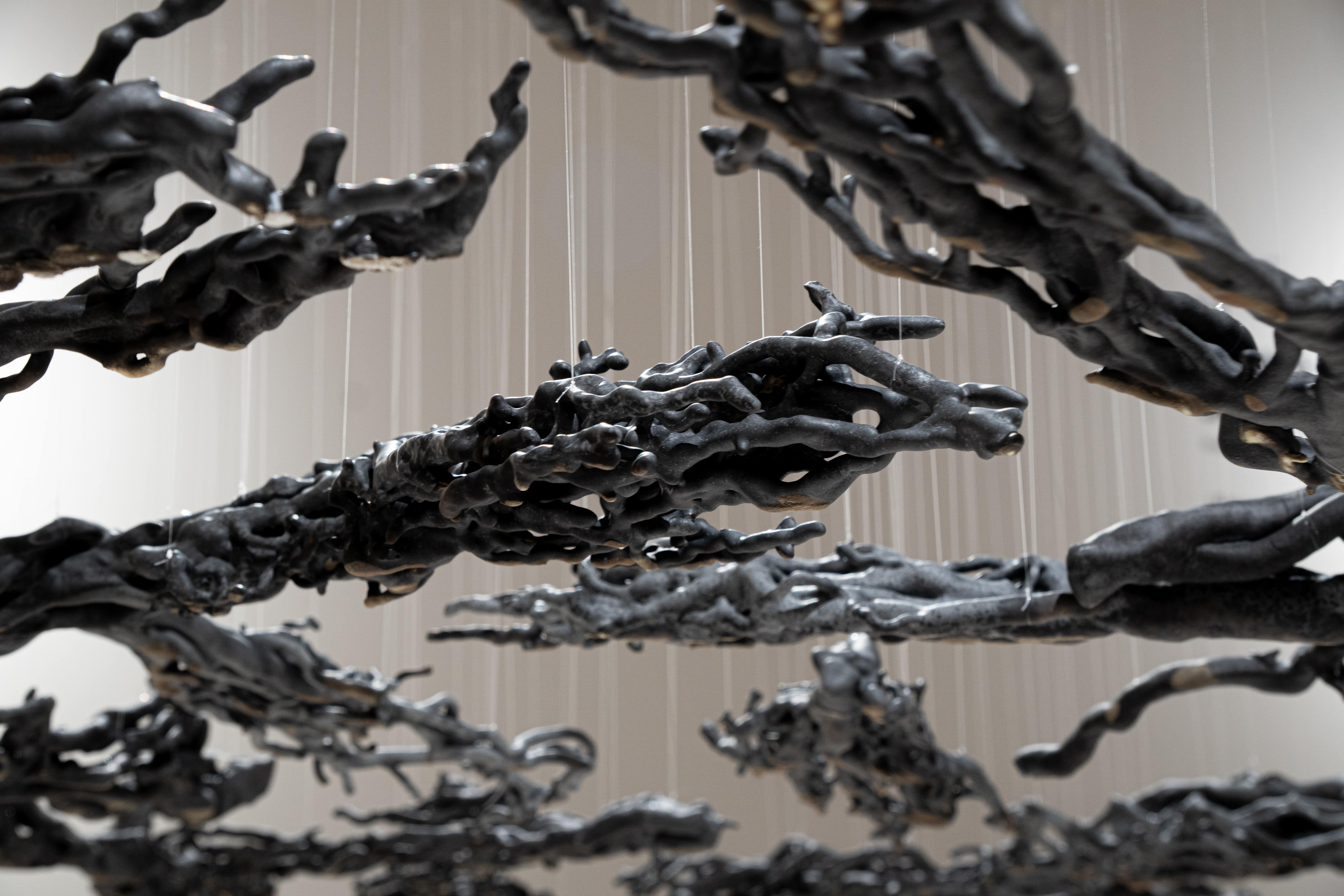 Triển lãm trưng bày 12 tác phẩm điêu khắc, sắp đặt và nhiếp ảnh, được tạo nên từ những chất liệu gần gũi như rễ cây, gỗ, đất, dây thừng, vải, sách giấy… Kết hợp cùng men gốm – chất liệu vốn sáng trong và bền vững – sự đối lập này tạo nên bề mặt thị giác vừa thô ráp, vừa rực rỡ, gợi nhắc đến sự giằng xé giữa nỗi đau và khát vọng hồi sinh.