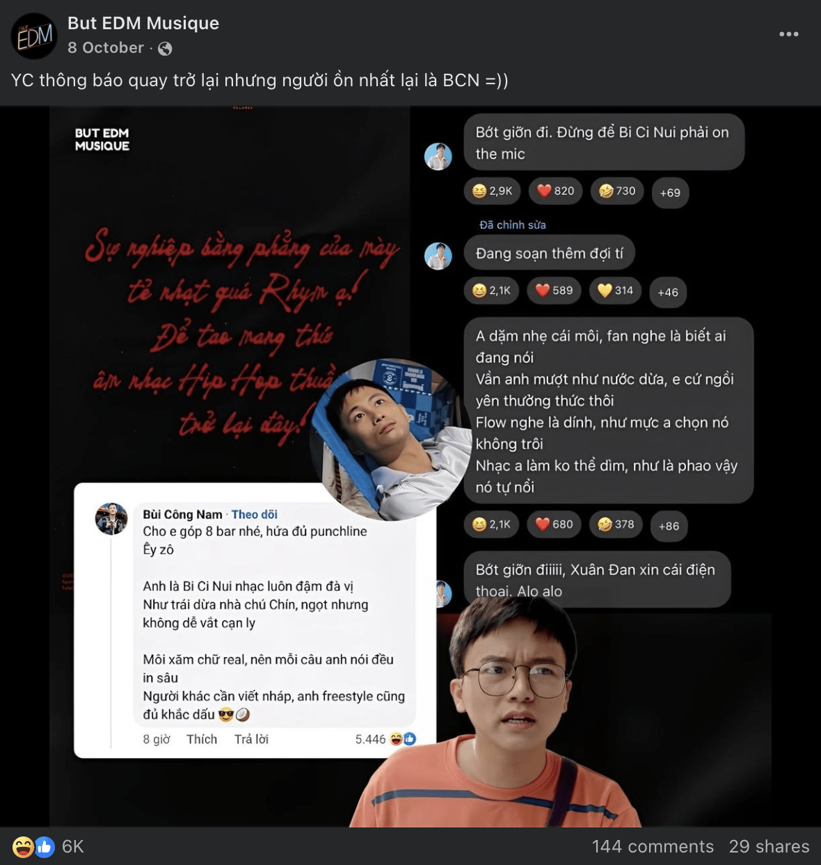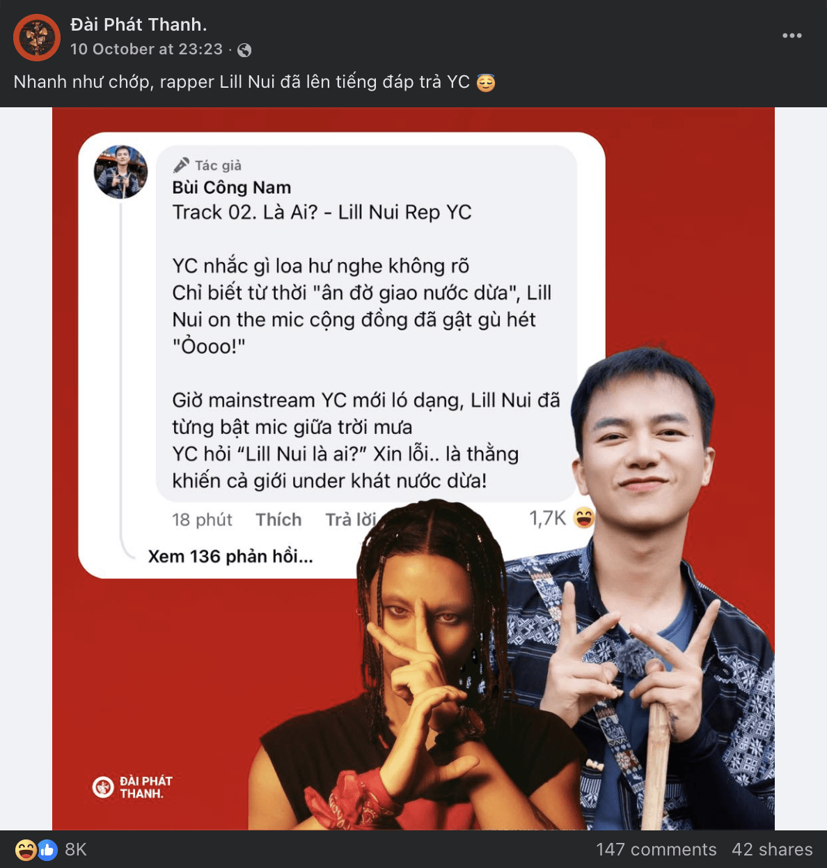 Đồng thời, khi “rapper qua đường” Lill Nui - Bùi Công Nam tham gia màn đối đáp với YC, chiến dịch được mở rộng không chỉ với cộng đồng yêu rap mà còn tiếp cận khán giả đại chúng cũng như fan hâm mộ của Anh Trai Vượt Ngàn Chông Gai. Nhờ đó, thông tin comeback của YC thoát khỏi vòng underground, góp phần giúp album “Đâu Ai Yêu Nghệ Thuật Đến Thế” leo Top Trending YouTube và đứng vị trí số một trên bảng xếp hạng iTunes Việt Nam.