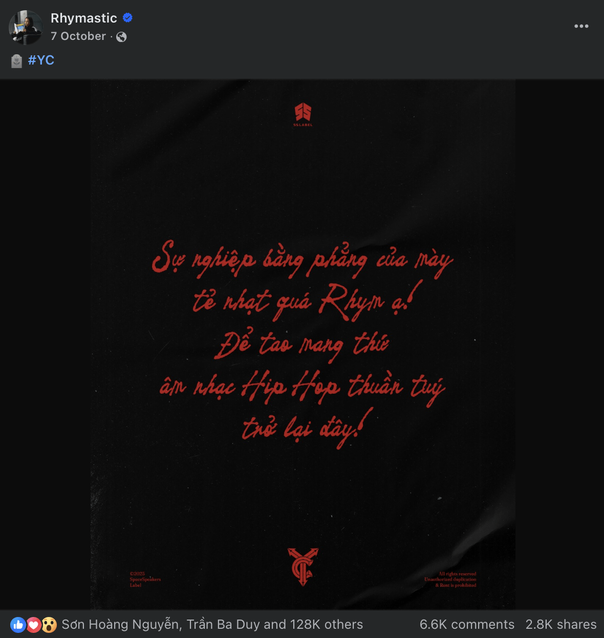Có thể thấy, chiến dịch của SpaceSpeakers Label khéo léo kết hợp nội dung âm nhạc chất lượng với chiến thuật lan tỏa cảm xúc, biến album thành tuyên ngôn cá nhân của YC. Trong bối cảnh thị trường dễ bị chi phối bởi xu hướng viral, việc xây dựng cuộc chiến ngầm giữa hai nhân vật trở thành bước đi táo bạo. Chiến lược này không chỉ làm nổi bật YC mà còn bảo vệ và phát triển hình ảnh Rhymastic, tạo nên mô hình truyền thông kép nơi nghệ sĩ truyền thống và bản ngã tương tác, nhưng vẫn giữ đường đi riêng và độc lập trên hành trình âm nhạc.