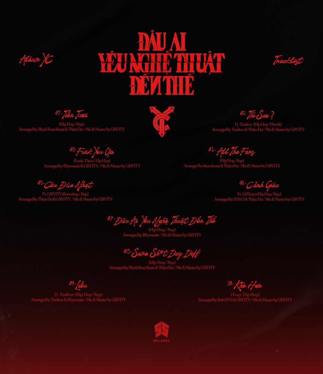 “Đâu Ai Yêu Nghệ Thuật Đến Thế” đánh dấu sự trở lại đầy táo bạo của YC sau nhiều năm im ắng và cũng là full album đầu tiên thể hiện thế giới nội tâm cùng cá tính âm nhạc của nam rapper. Với 10 ca khúc trải dài qua nhiều thể loại như rap, hiphop, funk, boombap và phonk, YC đã xây dựng nên một hành trình âm nhạc đầy kịch tính, đưa người nghe đi qua từng cung bậc cảm xúc, từ hào quang rực rỡ đến vực thẳm trống rỗng, từ kiêu ngạo đến tự vấn, từ sụp đổ đến hồi sinh.