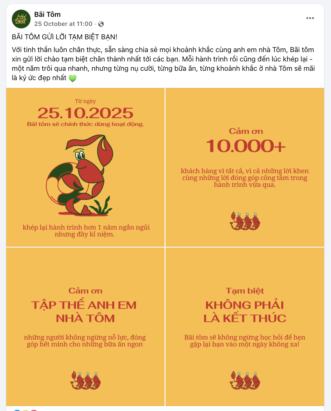 Lời chia tay của thương hiệu trong ngày 25/10 (Nguồn: Facebook Bãi Tôm)