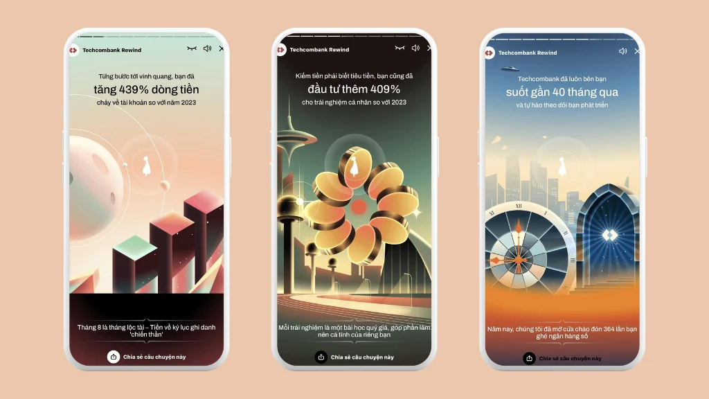 Techcombank cũng đã mở ra một hướng đi đầy khéo léo với Rewind khi biến dòng tiền khô khan thành chuyến du hành ký ức, giúp mỗi giao dịch được gắn với ý nghĩa về mối quan hệ, trải nghiệm hay cột mốc trưởng thành, qua đó định vị ngân hàng như người bạn đồng hành hiểu rõ từng bước tiến của khách hàng.