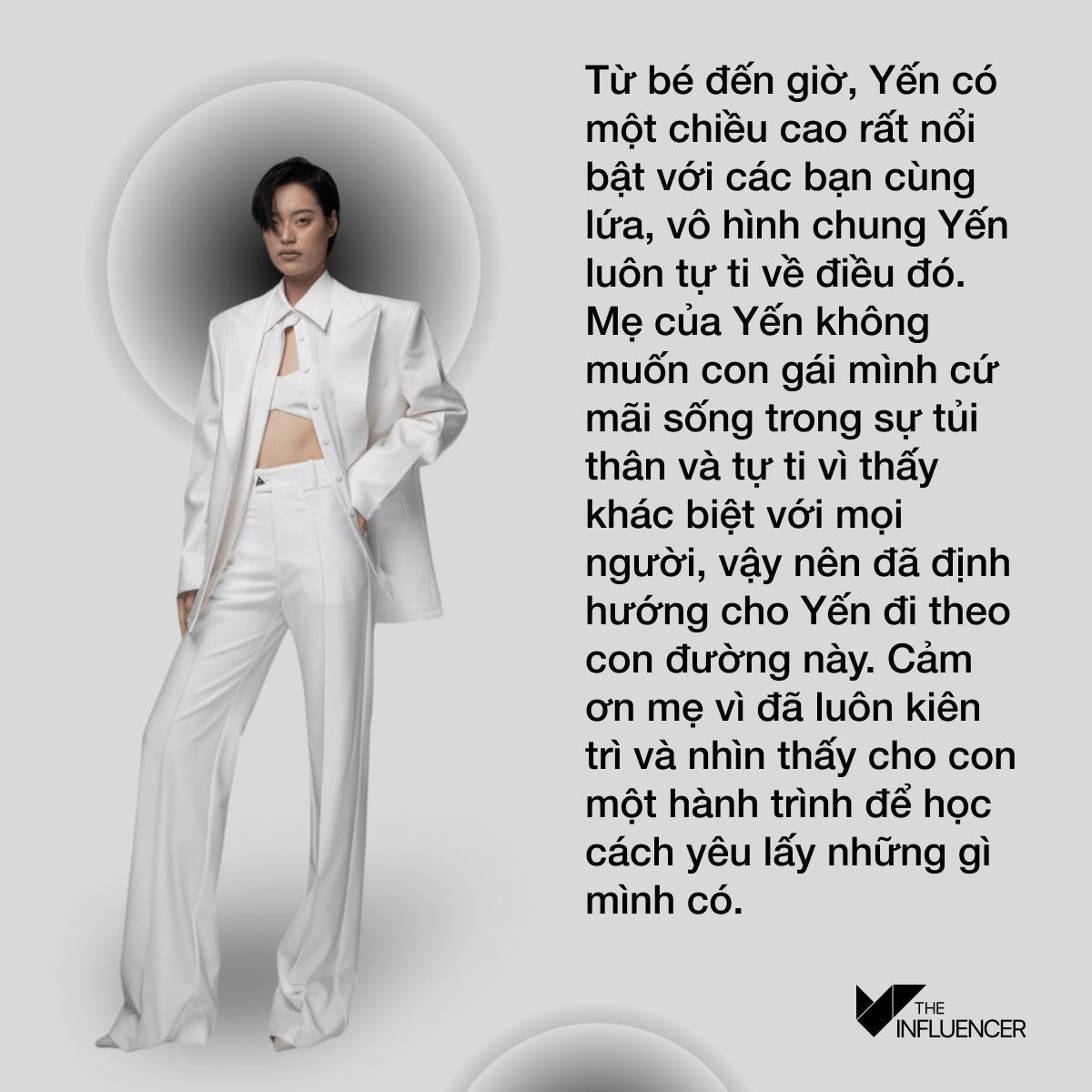 Ban đầu, việc trở thành một người mẫu là điều nằm ngoài dự định của Yến. Nhưng từ bé đến giờ, Yến có một chiều cao rất nổi bật với các bạn cùng lứa, vô hình chung Yến luôn tự ti về điều đó. Mẹ của Yến không muốn con gái mình cứ mãi sống trong sự tủi thân và tự ti vì thấy khác biệt với mọi người, vậy nên đã định hướng cho Yến đi theo con đường này. Cảm ơn mẹ vì đã luôn kiên trì và nhìn thấy cho con một hành trình để học cách yêu lấy những gì mình có. Và thật may mắn là cả gia đình Yến đều rất ủng hộ cho việc Yến trở thành người mẫu.