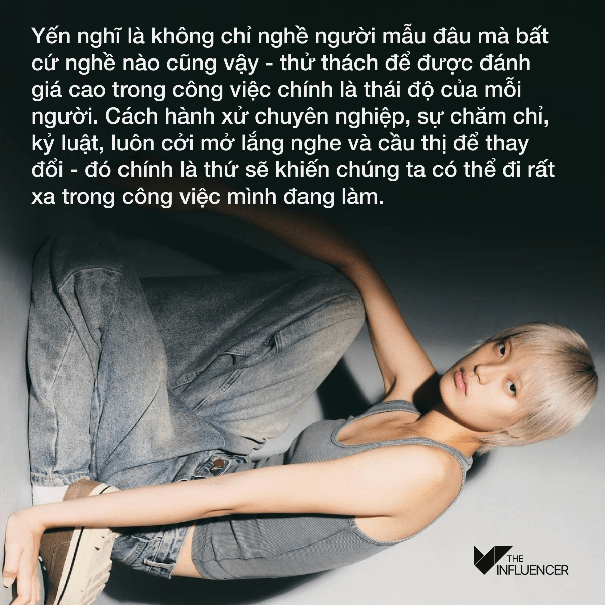 Yến nghĩ là không chỉ nghề người mẫu đâu mà bất cứ nghề nào cũng vậy - thử thách để được đánh giá cao trong công việc chính là thái độ của mỗi người. Cách hành xử chuyên nghiệp, sự chăm chỉ, kỷ luật, luôn cởi mở lắng nghe và cầu thị để thay đổi - đó chính là thứ sẽ khiến chúng ta có thể đi rất xa trong công việc mình đang làm.