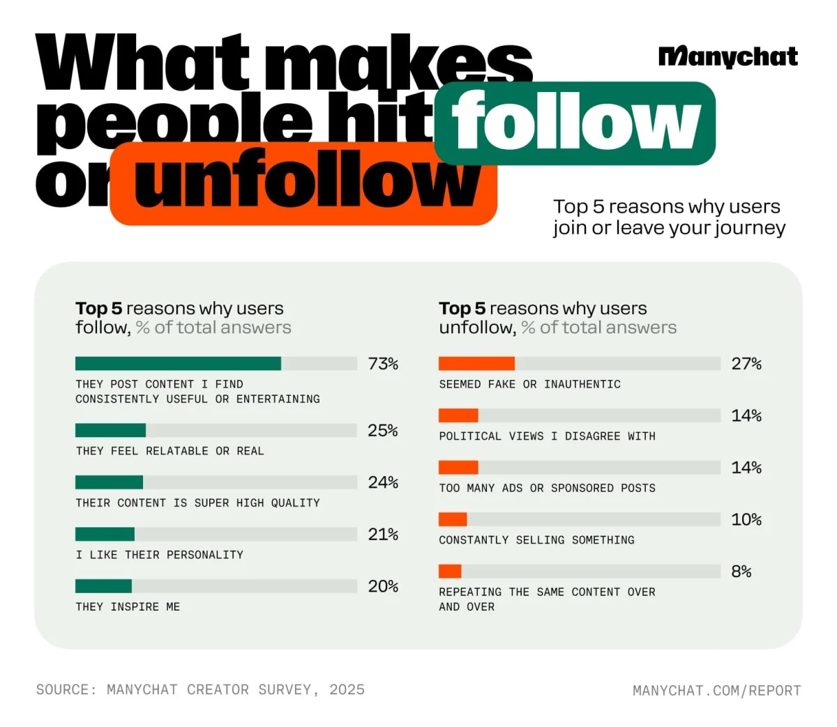 86% người xem cho rằng creator hiện nay kém chân thực hơn trước, và cảm giác giả tạo là lý do hàng đầu khiến họ nhấn unfollow. Nội dung mang màu sắc quảng cáo hoặc sắp đặt quá rõ ràng là yếu tố khiến họ dừng video ngay lập tức. Điều trớ trêu nằm ở chỗ lý do để nhấn follow lại rất đơn giản. Người xem tìm kiếm sự gần gũi, tính đồng cảm và giá trị thực tế. Họ muốn học được điều gì đó hoặc được truyền cảm hứng từ một con người cụ thể. Và rõ ràng, sự chân thật không thể được tối ưu bằng công thức hay tần suất đăng tải. Khi thuật toán liên tục thúc ép sản xuất và tiêu thụ, cả creator lẫn khán giả đều mệt mỏi, từ đó khiến khoảng cách tương tác ngày càng rộng thêm.