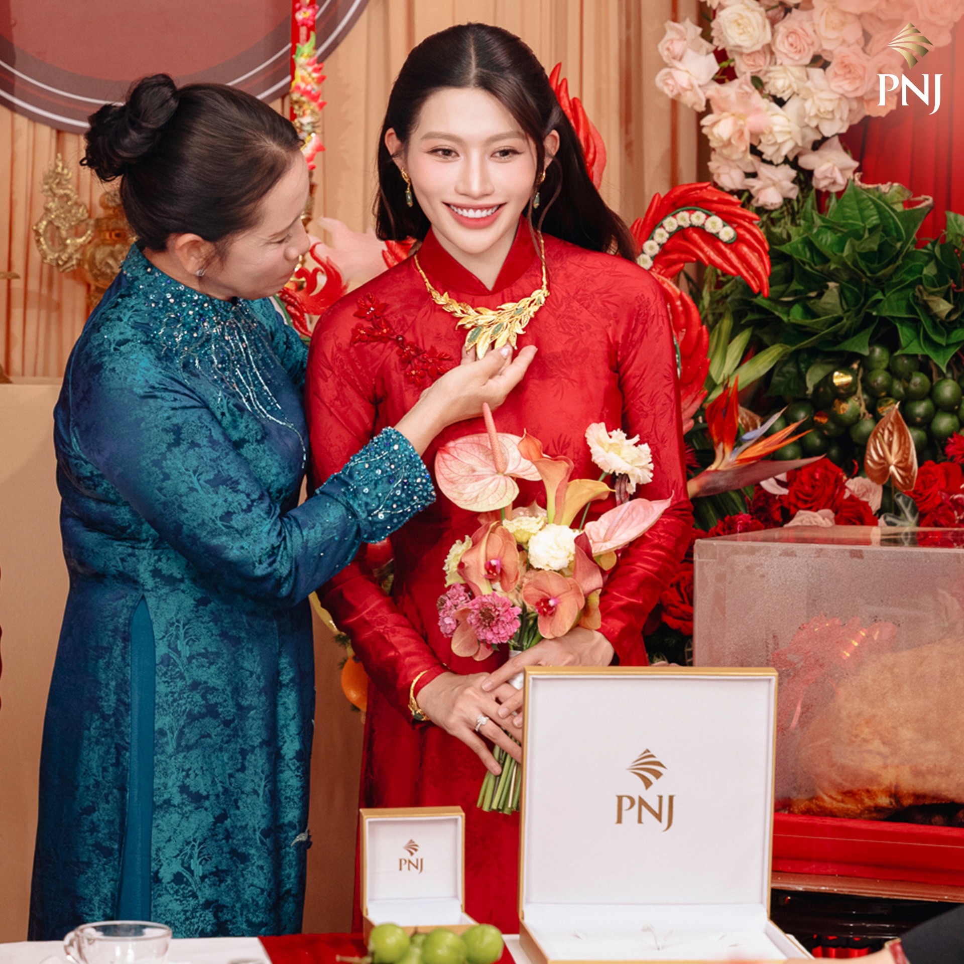 Bên cạnh đó, PNJ còn đồng hành cùng cặp đôi diễn viên Đình Tú - Ngọc Huyền hay Á hậu Chế Nguyễn Quỳnh Châu trong ngày trọng đại, cùng xuất hiện rạng rỡ trong trang sức vàng 24K thuộc bộ sưu tập Lá Ngọc Cành Vàng. Hình ảnh ấy không chỉ tôn vinh vẻ đẹp của người phụ nữ mà còn khắc họa sự nâng niu, trân trọng trong mỗi mối quan hệ. Tất cả những câu chuyện ấy đều hội tụ trong thông điệp Có nhau - một ý niệm giản dị nhưng sâu sắc, nói về sức mạnh của việc cùng nhau đi qua những chặng đường dài.