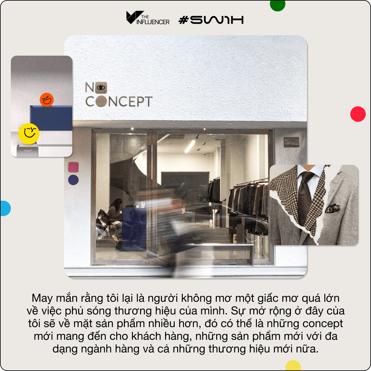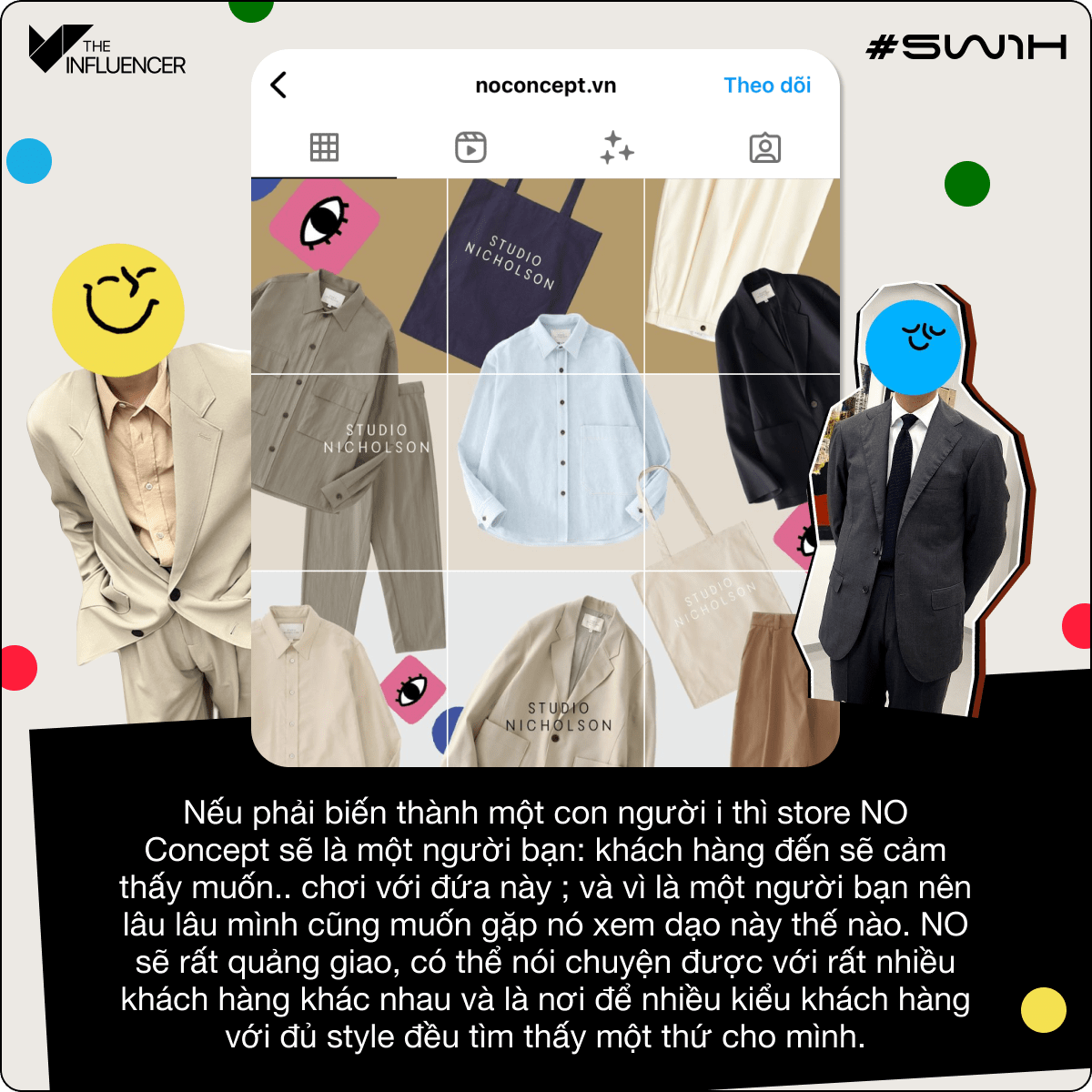 Thứ nhất, trong một thế giới mà ai cũng phải tỏ ra mình có một cá tính gì đấy, thì NO CONCEPT cho phép tôi được chuyển đổi. NO CONCEPT sẽ trưởng thành cùng khách hàng và không bị mắc kẹt ở một điểm cố định nào cả. Vậy nên cách tôi xây dựng branding cho cửa hàng đều hướng đến mọi đối tượng, cả người lớn tuổi lẫn người trẻ, từ những khách hàng đang có thói quen mua sắm mạnh tay cho đến những người trẻ tuổi tiềm năng trong tương lai sẽ đến với chúng tôi.