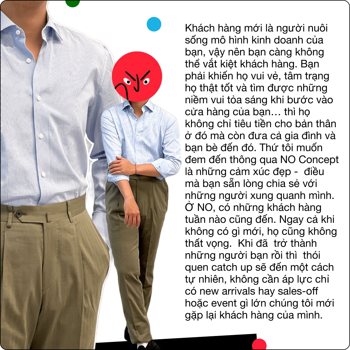 Colette là một giấc mơ của tuổi trẻ và tôi luôn nung nấu sẽ tạo ra một điểm đến như vậy ở Việt Nam. Ban đầu, mọi người xung quanh cũng có chút hoài nghi vì nghĩ rằng làm thế này thì… sao mà ra tiền? Mạo hiểm. Điên rồ. Trong khi những công việc khác người ta chạy theo doanh số, gán kpi cho các bạn salemans rồi tìm cách để go viral, tạo ra những cơn sốt khan hiếm giả… Tôi lại nghĩ khác. Khách hàng mới là người nuôi sống mô hình kinh doanh của bạn, vậy nên bạn càng không thể vắt kiệt khách hàng. Bạn phải khiến họ vui vẻ, tâm trạng họ thật tốt và tìm được những niềm vui tỏa sáng khi bước vào cửa hàng của bạn… thì họ không chỉ tiêu tiền cho bản thân ở đó mà còn đưa cả gia đình và bạn bè đến đó. Thứ tôi muốn đem đến thông qua NO Concept là những cảm xúc đẹp - điều mà bạn sẵn lòng chia sẻ với những người xung quanh mình. Ở NO, có những khách hàng tuần nào cũng đến. Ngay cả khi không có gì mới, họ cũng không thất vọng. Khi đã trở thành những người bạn rồi thì thói quen catch up sẽ đến một cách tự nhiên, không cần áp lực chỉ có new arrivals hay sale off hoặc event gì lớn chúng tôi mới gặp lại khách hàng của mình.