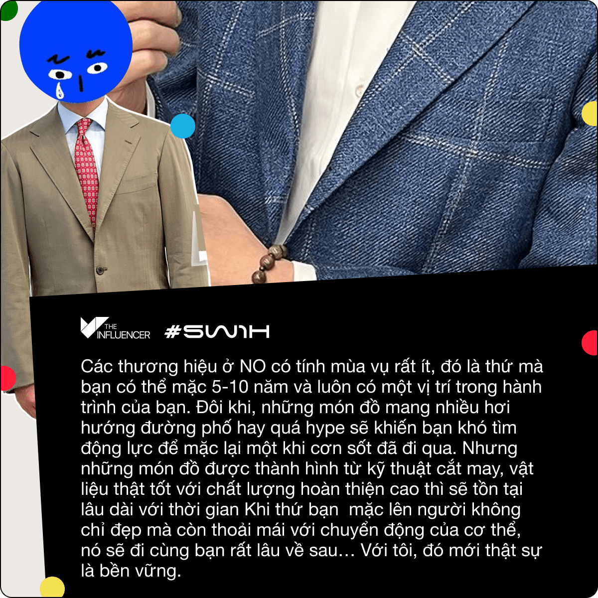 Các sản phẩm ở NO có một điểm chung là… rất ít người biết đến thương hiệu chúng. Tất cả đều là những cái tên không quá phổ biến nhưng chất lượng rất cao. Thói quen mua đồ của xã hội tiêu dùng hiện đại những năm gần đây thường tập trung vào những thứ được thổi phồng bởi marketing, bởi branding và các KOL, còn những thương hiệu này rất trầm lặng, “ít nói” nhưng vô cùng giá trị. Chúng tôi muốn thay đổi mindset của khách hàng về chính tâm lý mua sắm của họ. Khi mua một món đồ, tôi nghĩ ai cũng muốn hiểu mình đã bỏ số tiền cụ thể này ra để mua cái gì? Nếu tôi mua một món đồ Dior thì đồng tiền bỏ ra còn để mua câu chuyện, mua lịch sử và tất nhiên là mua giấc mơ mà Dior mang đến cho bạn. Ở NO, bạn sẽ bỏ tiền mua những chiếc blazers mặc vào thoải mái, nó sẽ đi theo chuyển động của người mặc chứ không kéo tay họ lại khi đang cần cử động bắt tay hay điều khiển vô-lăng lái xe , có thể mặc đi gặp đối tác nhưng cũng có thể mặc để đi hẹn hò, đi ăn tối cùng bạn bè hoặc đi chơi cùng gia đình . Chúng tôi mang đến những sản phẩm có giá trị - vừa thoải mái về mặt cảm giác vừa đảm bảo chất lượng và tính thẩm mỹ - những điều sẽ đi cùng khách hàng một đoạn đường dài chứ không chỉ một vài lần rồi thôi.