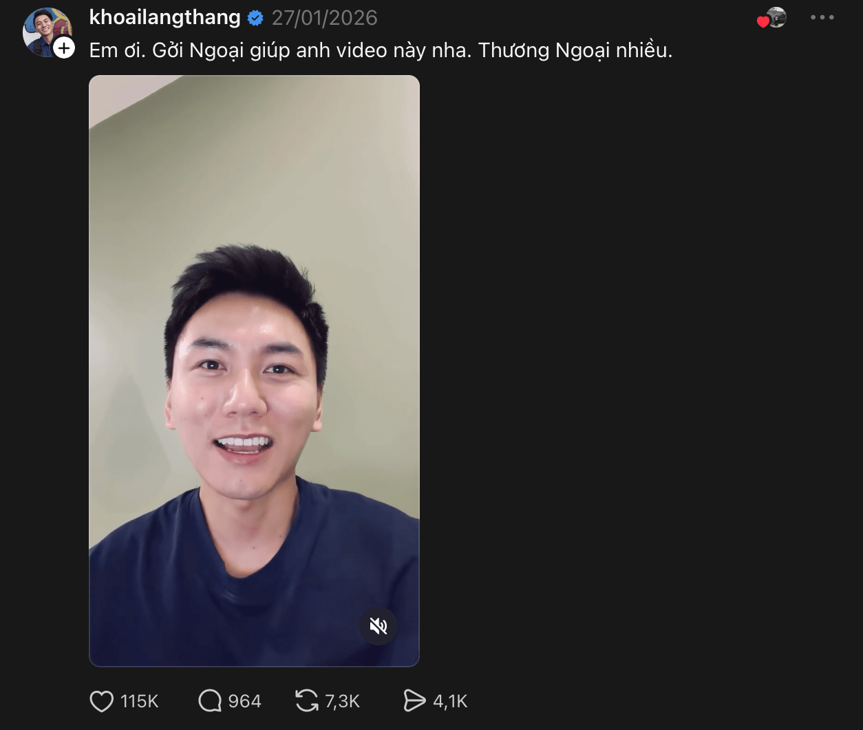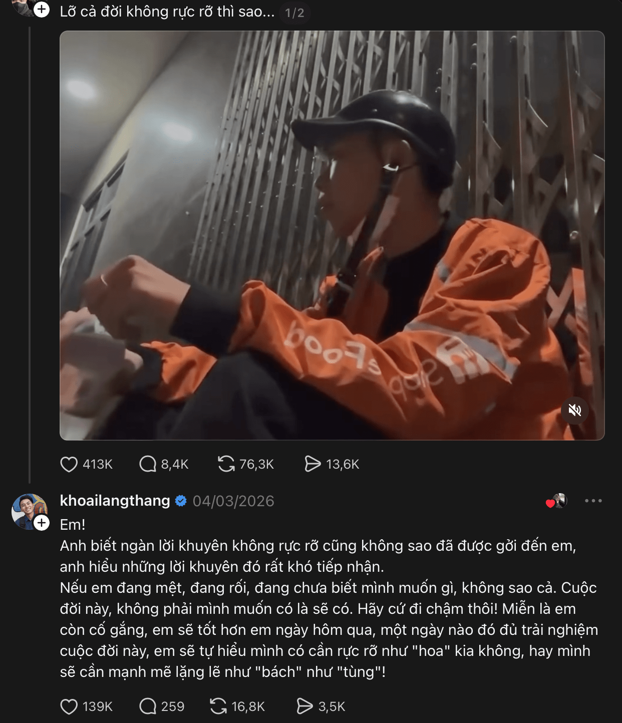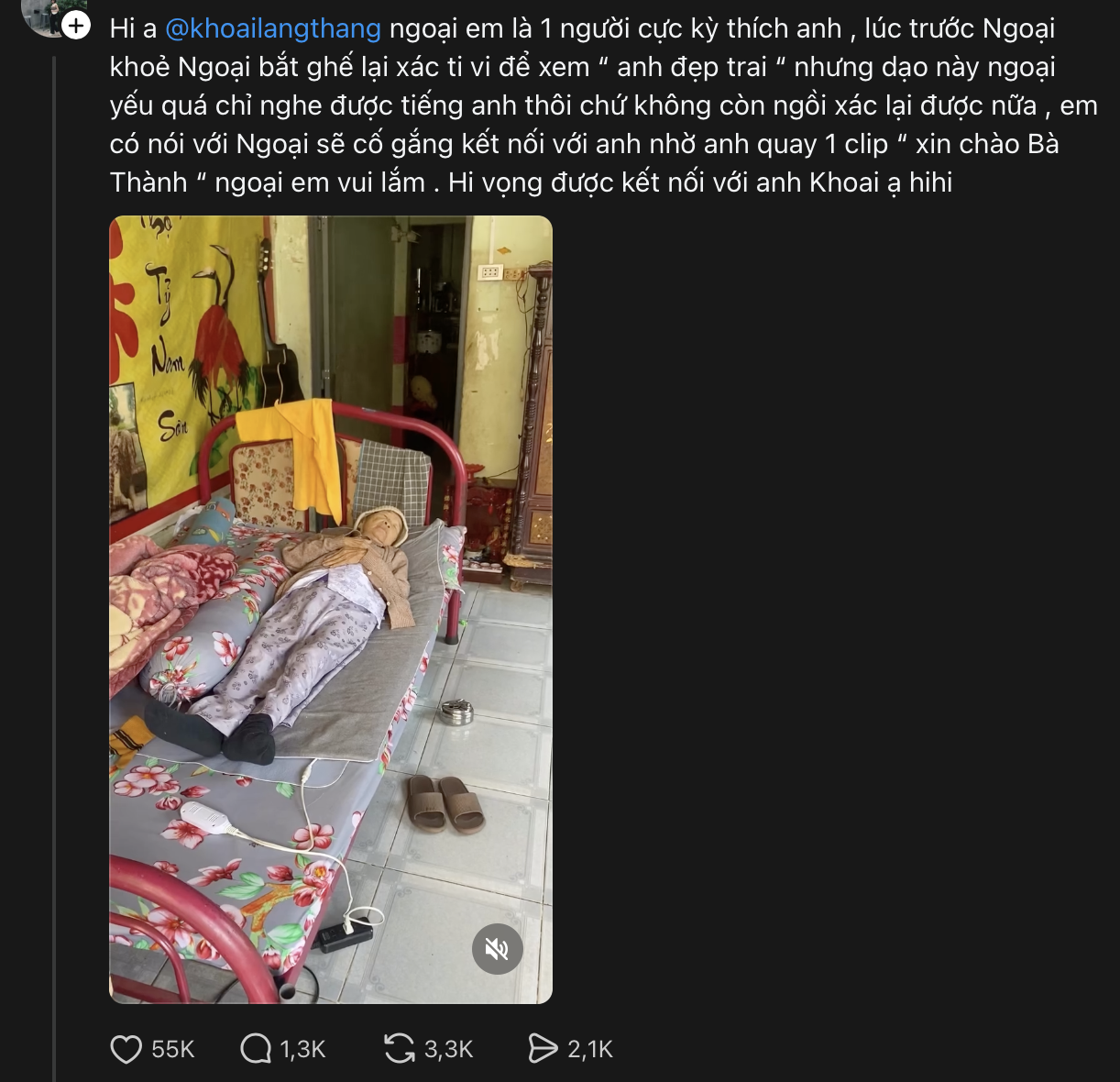 Không phải ngẫu nhiên mà Khoai Lang Thang lại trở thành một trong những creator hiếm hoi có thể duy trì được sự kết nối cảm xúc bền vững với khán giả đa dạng độ tuổi. Tiêu biểu như một bài post trên Threads gần đây chia sẻ về một cụ già luôn yêu quý anh và theo dõi anh từ lâu, nhưng giờ đây sức khỏe yếu nên chỉ có thể nghe được tiếng trong tivi. Khoai Lang Thang đã nhanh chóng bình luận bên dưới bài viết bằng video, gửi lời cảm ơn đến cụ và chúc cụ luôn khoẻ mạnh. Ngoài ra, anh cũng tích cực tương tác các bạn trẻ, động viên các bạn trong những giây phút khó khăn và yếu lòng. Những hành động này không chỉ tạo ra lượt tương tác ngay lập tức mà còn góp phần xây dựng một hình ảnh creator gần gũi, đáng tin cậy và có trách nhiệm với cộng đồng của mình.