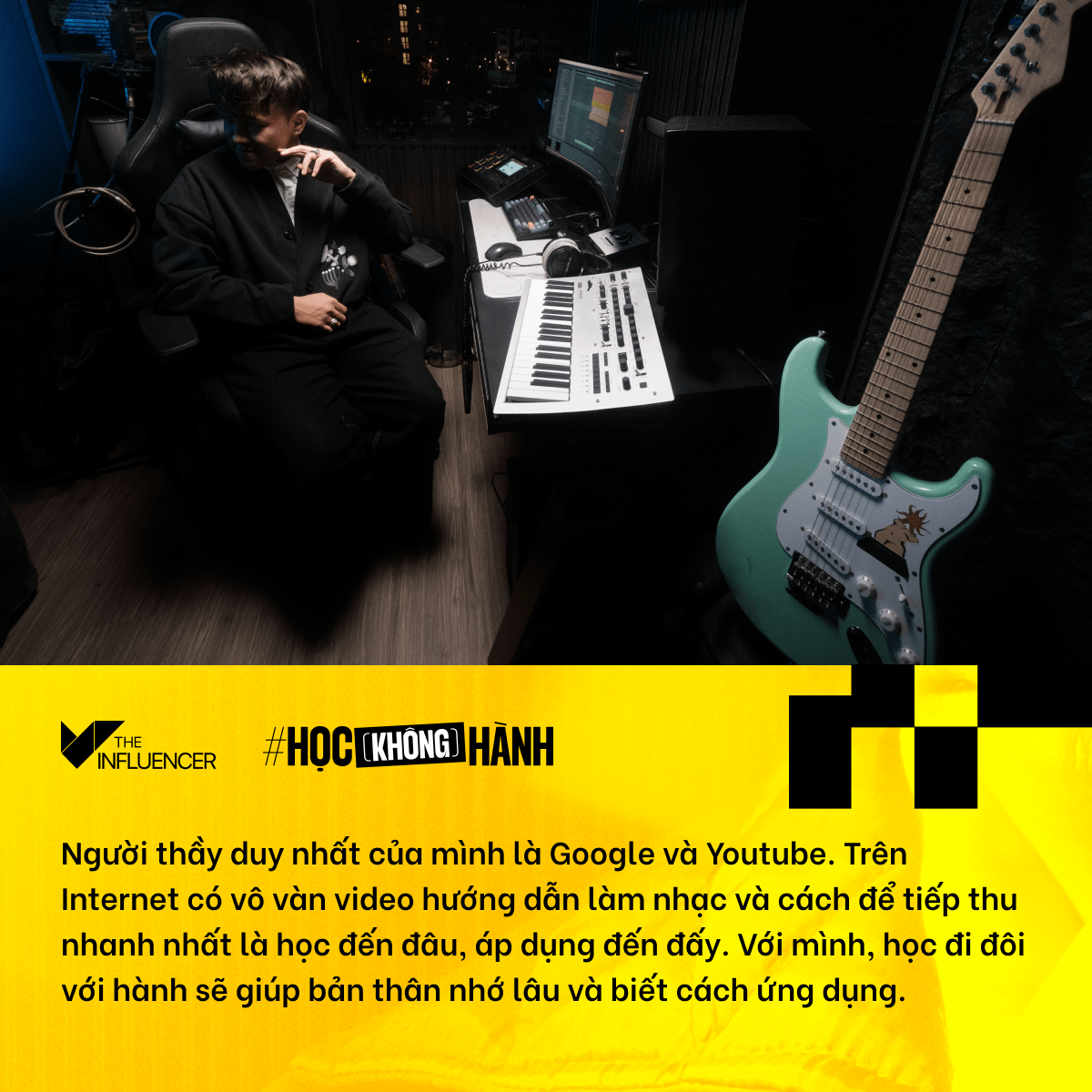 Người thầy duy nhất của mình là Google và Youtube. Internet có vô vàn video hướng dẫn làm nhạc và cách để tiếp thu nhanh nhất là học đến đâu, áp dụng đến đấy. Với mình, học đi đôi với hành sẽ giúp bản thân nhớ lâu và biết cách ứng dụng. Khi tham gia CDSL và gặp gỡ anh chị có kinh nghiệm trong nghề, mình được học tập và giúp đỡ rất nhiều. Anh chị sẵn sàng chia sẻ các công cụ hỗ trợ để làm nhanh hơn hay giai điệu ấn tượng hơn.