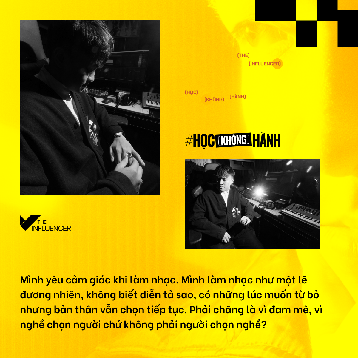 Học nhạc là điều cần thiết, nhưng quan trọng nhất vẫn là cảm xúc. Khi có cảm xúc, ý tưởng đến, bạn sẽ đưa được nó vào âm nhạc. Với mình, nhạc lý là nền tảng để bản thân biết có công cụ gì để sử dụng, chứ không thể làm linh tinh. Thời điểm này, mình đã bắt đầu học nhạc lý tử tế vì muốn sản phẩm cá nhân hay hơn, không bị rập khuôn theo mô thức cũ.