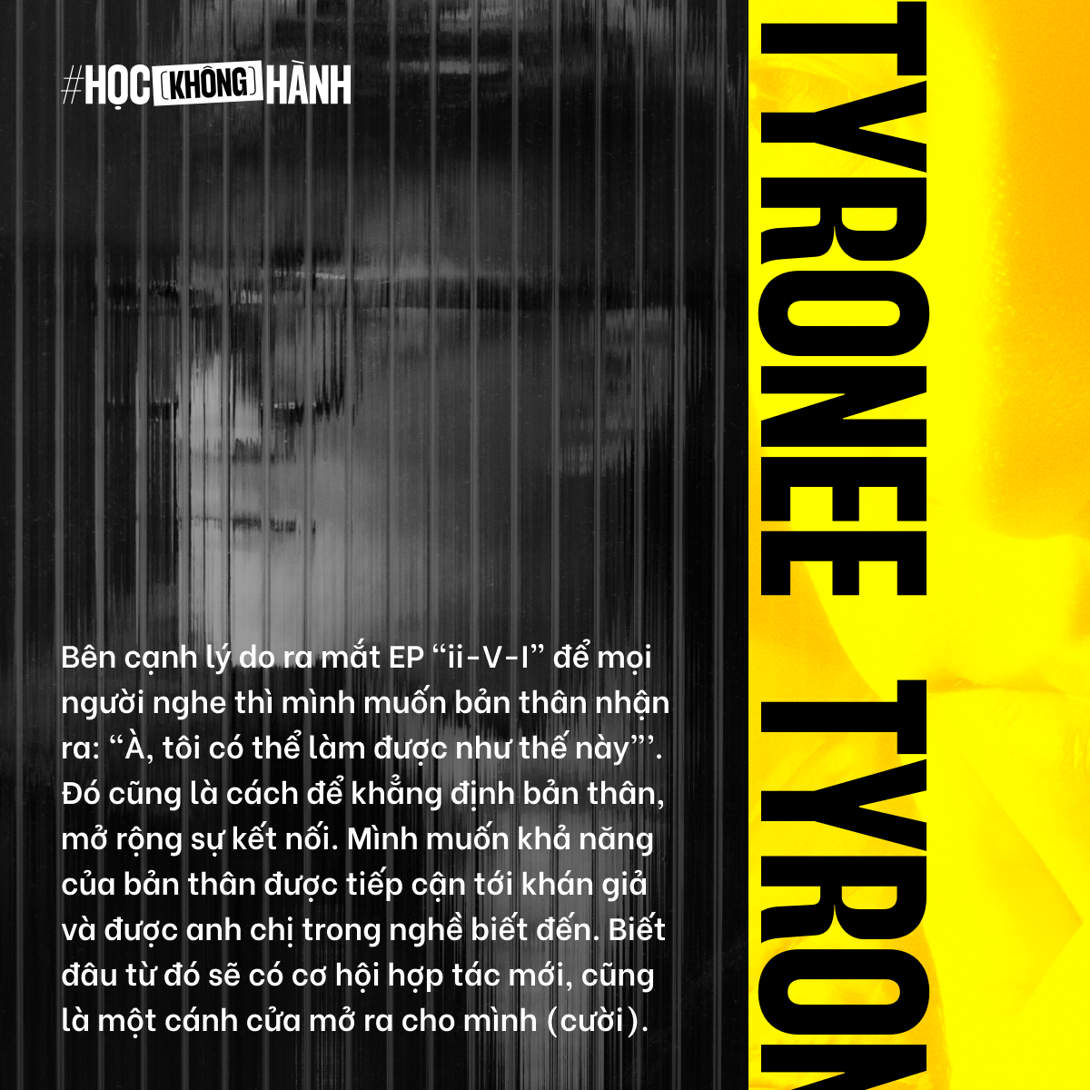 Mình ấp ủ ra mắt EP “ii-V-I” từ năm 2023. Lý do đơn giản là có những bài mình thấy hay nhưng chưa từng công bố, để mãi thì phí nên quyết định làm tới cùng. EP đầu tay là tập hợp các bản nhạc sáng tác trong khoảng 2–6 năm trước. Chẳng hạn, bản thảo đầu tiên của Something Left là từ 2019, khi mình mới bước vào năm thứ hai làm nhạc. Các ca khúc trong EP không liên quan trực tiếp đến nhau nhưng đều mang chất riêng trong âm nhạc của Tyronee.