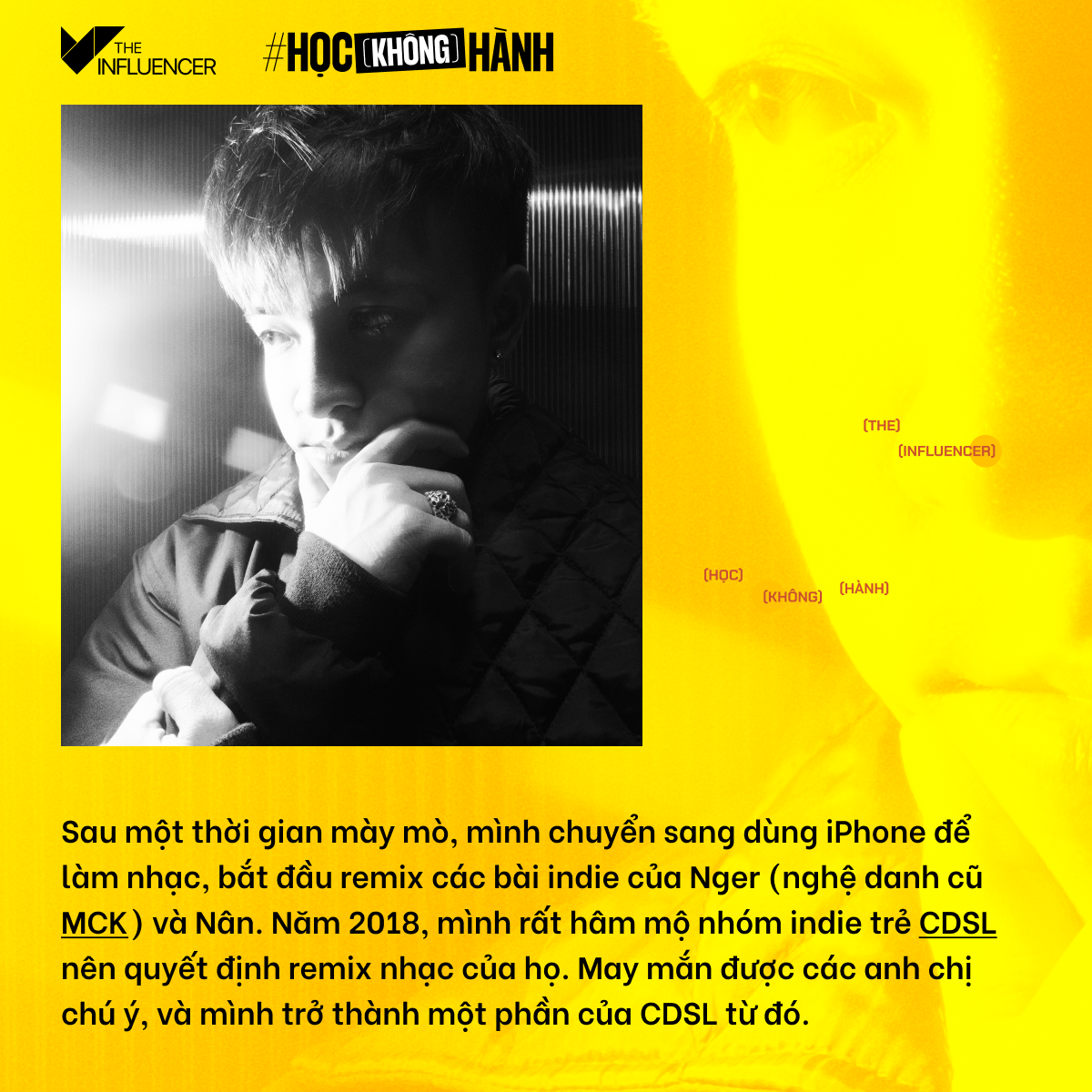 Sau một thời gian mày mò, mình chuyển sang dùng iPhone để làm nhạc, bắt đầu remix các bài indie của Nger (nghệ danh cũ MCK) và Nân. Năm 2018, mình rất hâm mộ nhóm indie trẻ CDSL nên quyết định remix nhạc của họ. May mắn được các anh chị chú ý, và mình trở thành một phần của CDSL từ đó.