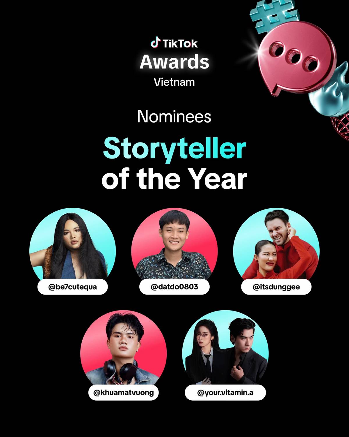 TikTok Awards Việt Nam 2025 quay lại với 16 hạng mục và 74 gương mặt được đề cử. Trong đó, hạng mục “Người kể chuyện của năm - Storyteller of the Year” là giải thưởng tôn vinh những cá nhân nổi bật trong lĩnh vực sáng tạo nội dung kịch bản - diễn xuất, đặc biệt là các sản phẩm hài kịch được đầu tư chỉn chu, giàu tính sáng tạo và cuốn hút. Thông qua những tác phẩm chất lượng cao, họ không chỉ mang đến tiếng cười và cảm xúc cho khán giả, mà còn khẳng định dấu ấn cá nhân, góp phần lan tỏa những giá trị tích cực đến cộng đồng.