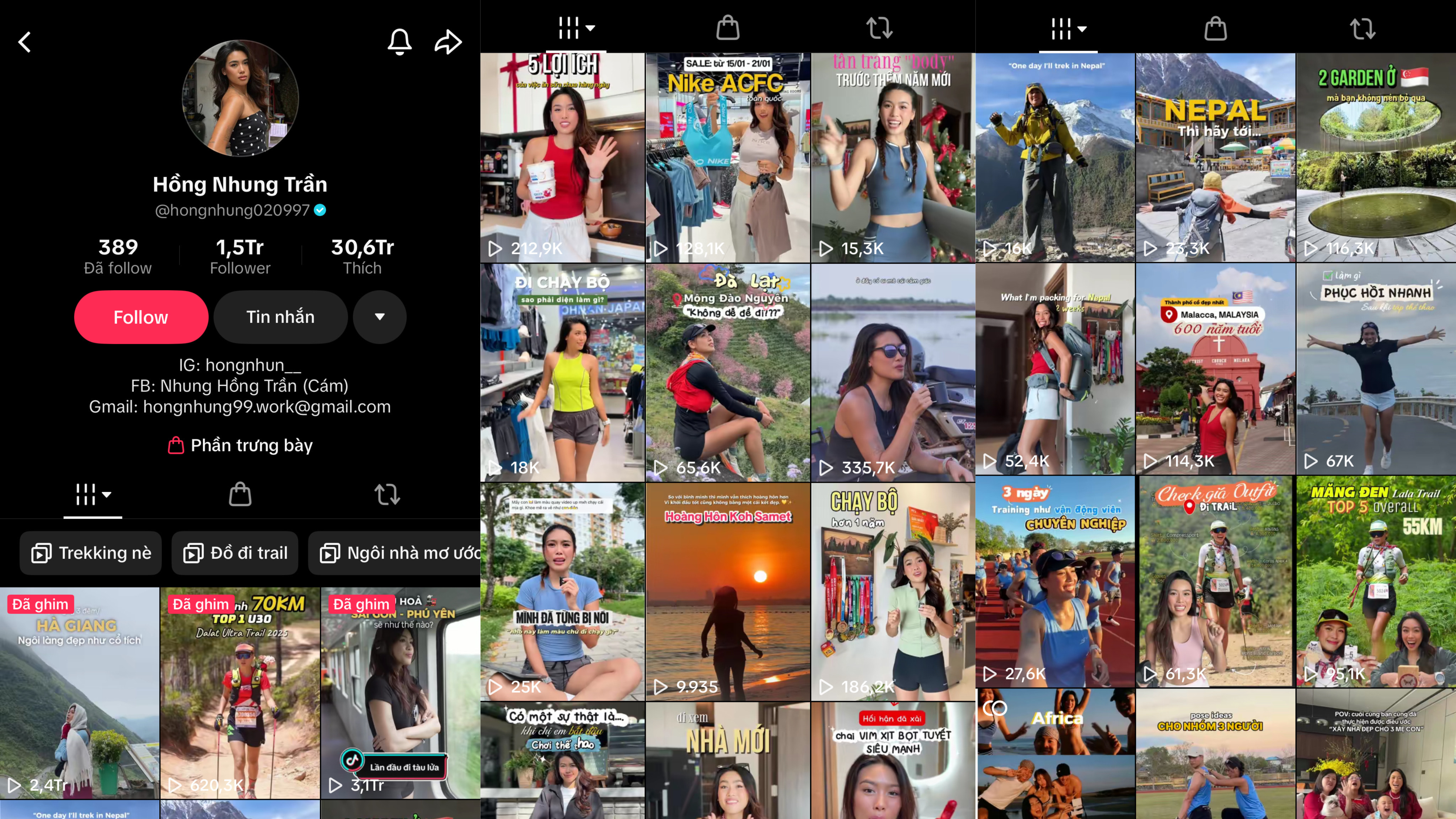 Ngoài ra, Hồng Nhung Trần cũng có những video chia sẻ khác cực kỳ hữu ích cho việc trekking. Từ những trải nghiệm trekking chuyên nghiệp tại Việt Nam cho đến các đất nước như Nepal, Ấn Độ, hay thậm chí là những video chân thực về việc tham gia các giải chạy dài cần thể lực thế nào, nên chuẩn bị ra sao đặc biệt khi thời tiết không thuận lợi… Việc video của cô nhận được nhiều phản hồi tích cực cũng cho thấy nhu cầu rất lớn của người trẻ trong việc tìm kiếm một nguồn thông tin đáng tin cậy, nơi họ có thể học hỏi từ những người đi trước thông qua TikTok.