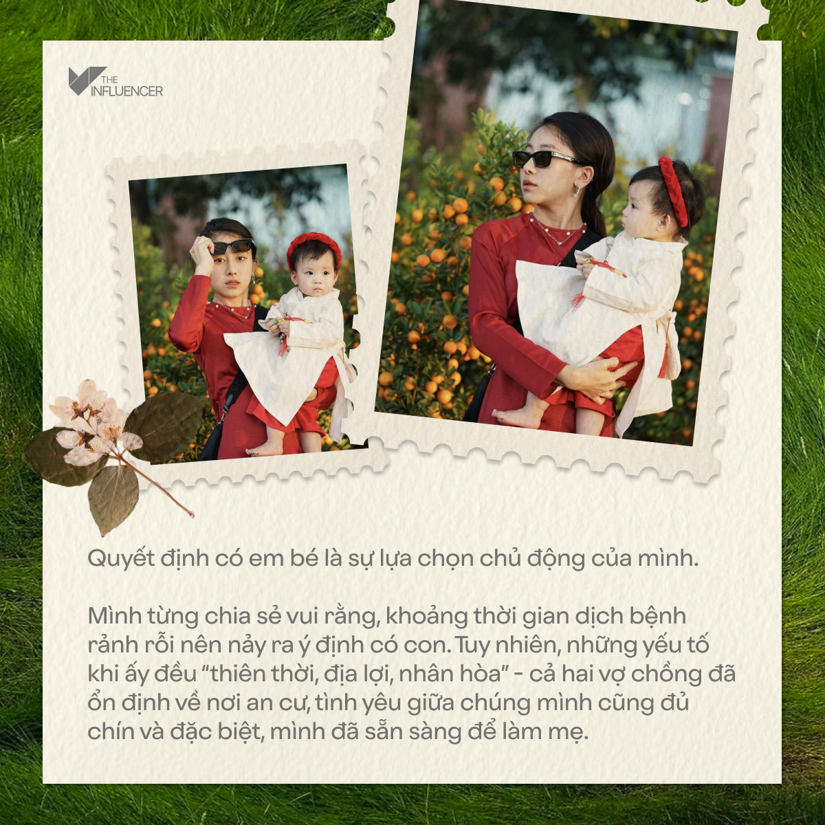 Mình từng chia sẻ vui rằng, khoảng thời gian dịch bệnh rảnh rỗi nên nảy ra ý định có con. Tuy nhiên, những yếu tố khi ấy đều “thiên thời, địa lợi, nhân hòa” - cả hai vợ chồng đã ổn định về nơi an cư, tình yêu giữa chúng mình cũng đủ chín và đặc biệt, mình đã sẵn sàng để làm mẹ. Chia sẻ vui bên lề, bạn bè cũng là “chất xúc tác” khiến mình mạnh dạn thêm. Vậy nên, mình cảm thấy an toàn với lựa chọn của chính mình.