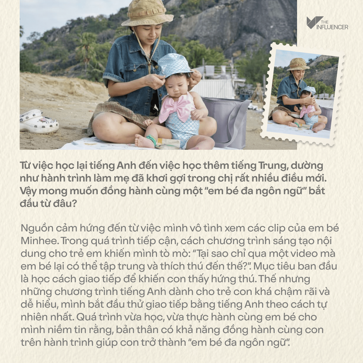 Từ việc học lại tiếng Anh đến việc học thêm tiếng Trung, dường như hành trình làm mẹ đã khơi gợi trong chị rất nhiều điều mới. Vậy mong muốn đồng hành cùng một “em bé đa ngôn ngữ” bắt đầu từ đâu?