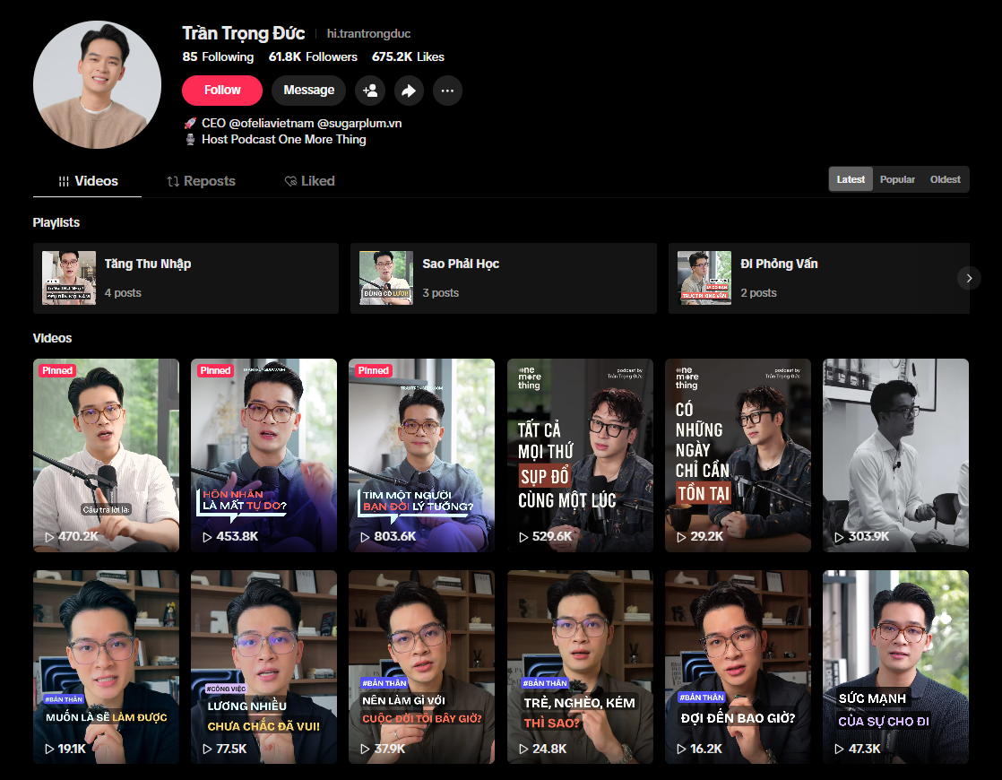 Không phải một creator thuần về tài chính, Trần Trọng Đức (1995) mang đến một góc nhìn khác: tài chính cá nhân gắn liền với hành trình vận hành doanh nghiệp. Là CEO của OFÉLIA Vietnam và Sugarplum, đồng thời là host podcast “One More Thing”, anh hiện sở hữu hơn 61.800 người theo dõi trên TikTok, nơi nội dung xoay quanh khởi nghiệp, hiệu suất làm việc và phát triển bản thân.