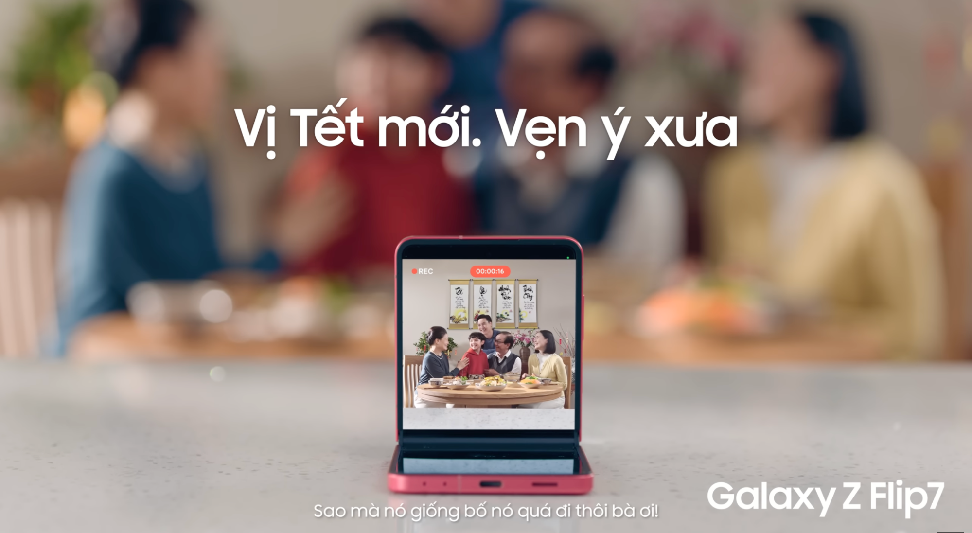 Trong mạch kể đó, sản phẩm không đóng vai trung tâm mà xuất hiện như một lớp trung gian. Điện thoại Samsung (Galaxy Z Flip7 và Galaxy S25 Ultra) cùng với AI Gemini hiện diện để ghi lại khoảnh khắc, hỗ trợ truyền tải ký ức Tết xưa, hướng dẫn làm đầu lân, nấu thị đông đặc trưng ngày Tết. Công nghệ không được đặt như biểu tượng của thay đổi, mà như công cụ giúp các giá trị truyền thống tiếp tục được lưu giữ và chia sẻ. Bằng cách triển khai câu chuyện thành một chuỗi TVC nhất quán trên nhiều dòng sản phẩm, Samsung cho thấy một tuyên bố dài hơi: công nghệ không làm Tết xa đi, mà giúp Tết ở lại lâu hơn trong đời sống hiện đại.