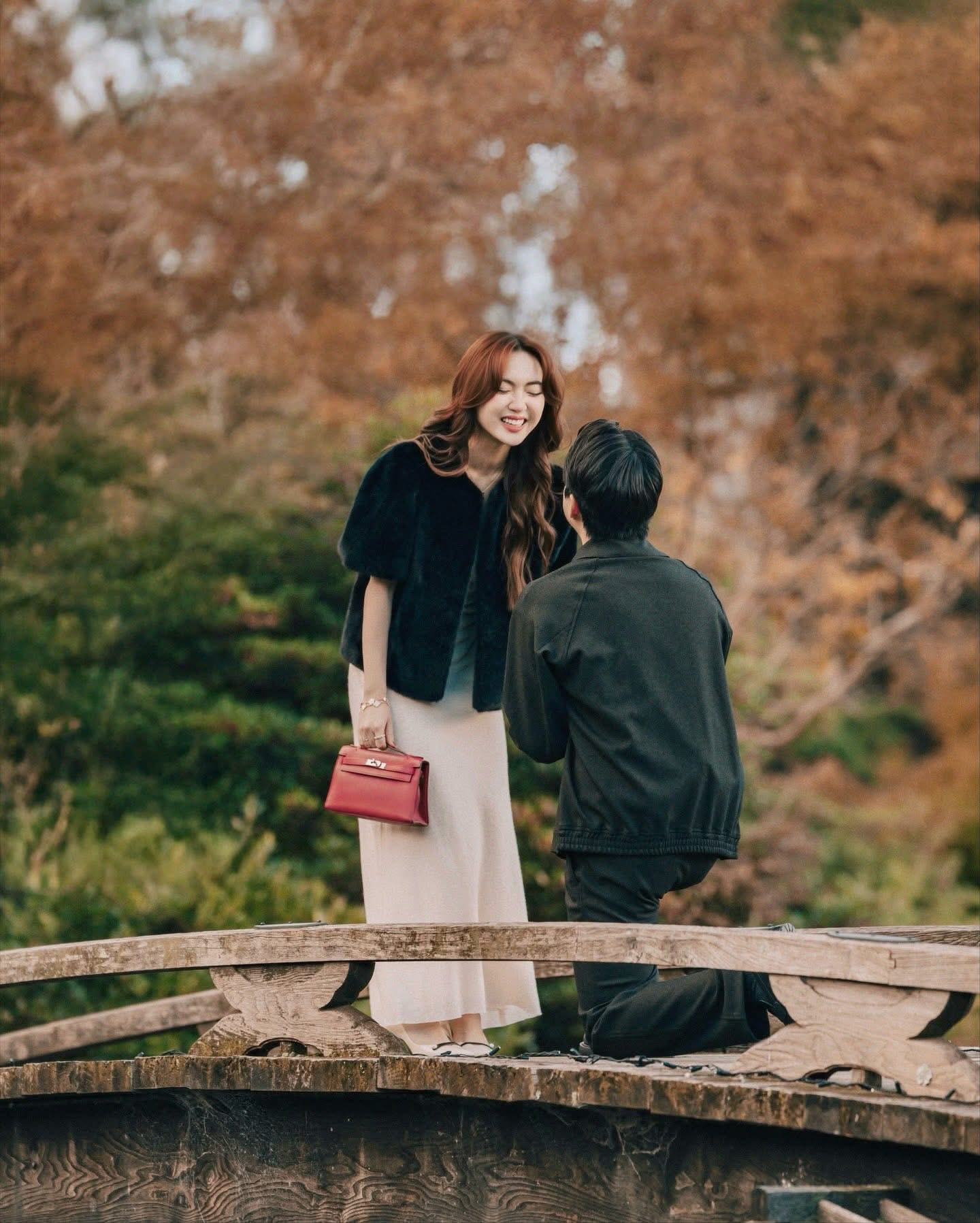 Trong danh sách những đám cưới được mong chờ của giới influencer Việt, câu chuyện của Chloe Nguyễn và bạn trai Zim chắc chắn là cái tên nổi bật. Đầu tháng 11/2025, mạng xã hội bất ngờ bùng nổ khi Chloe Nguyễn chia sẻ khoảnh khắc được bạn trai lâu năm quỳ gối cầu hôn trong chuyến du lịch tại Kyoto, Nhật Bản. Trong loạt ảnh được đăng tải, Zim trao nhẫn cho Chloe trên một cây cầu gỗ nhỏ giữa khung cảnh hồ nước yên bình, phía sau là cầu vồng xuất hiện đúng khoảnh khắc đặc biệt, tạo nên một khung hình lãng mạn tuyệt đẹp.