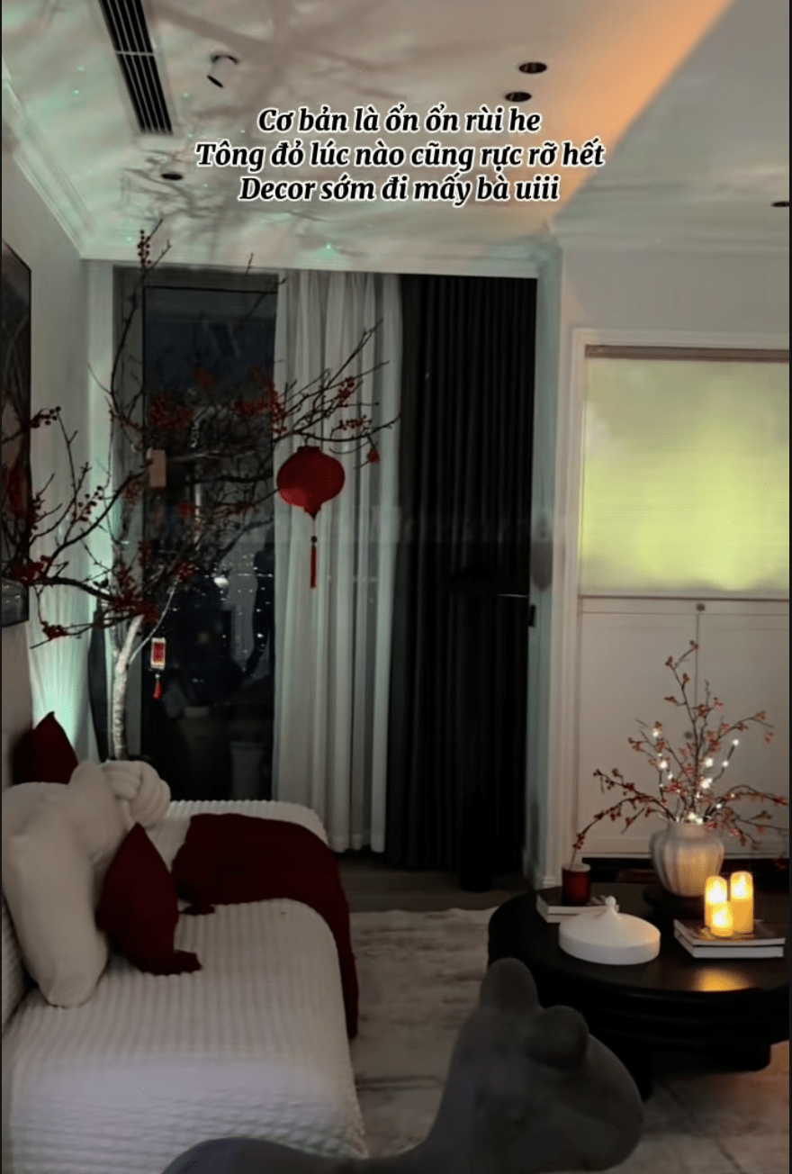 Với decor Tết, Phương lựa chọn tone trắng tinh tế kết hợp sắc đỏ đặc trưng, thể hiện qua cành đào, khăn phủ bàn, nến và các chi tiết nhỏ khác. Cách phối màu tiết chế giúp không gian vừa giữ được không khí lễ, vừa tạo cảm giác ấm cúng và dễ áp dụng cho nhà ở thực tế. Đây là kênh phù hợp để tham khảo những ý tưởng decor Tết nhẹ nhàng, thiết thực, không quá phô trương.