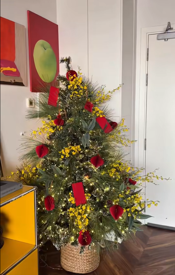 Chưa kể, mỗi dịp Tết, anh tiếp tục gây chú ý với áo dài và cách decor mang đậm dấu ấn stylist. Dù còn khá sớm, Hoàng Ku đã gợi mở tinh thần Tết Bính Ngọ bằng ý tưởng cây thông “Merry cung hỷ Christmas phát tài” - kết hợp cây thông xanh, đèn vàng, mai vàng và lồng đèn đỏ. Một cách nối dài mùa lễ hội, mới lạ nhưng vẫn đậm không khí Tết.