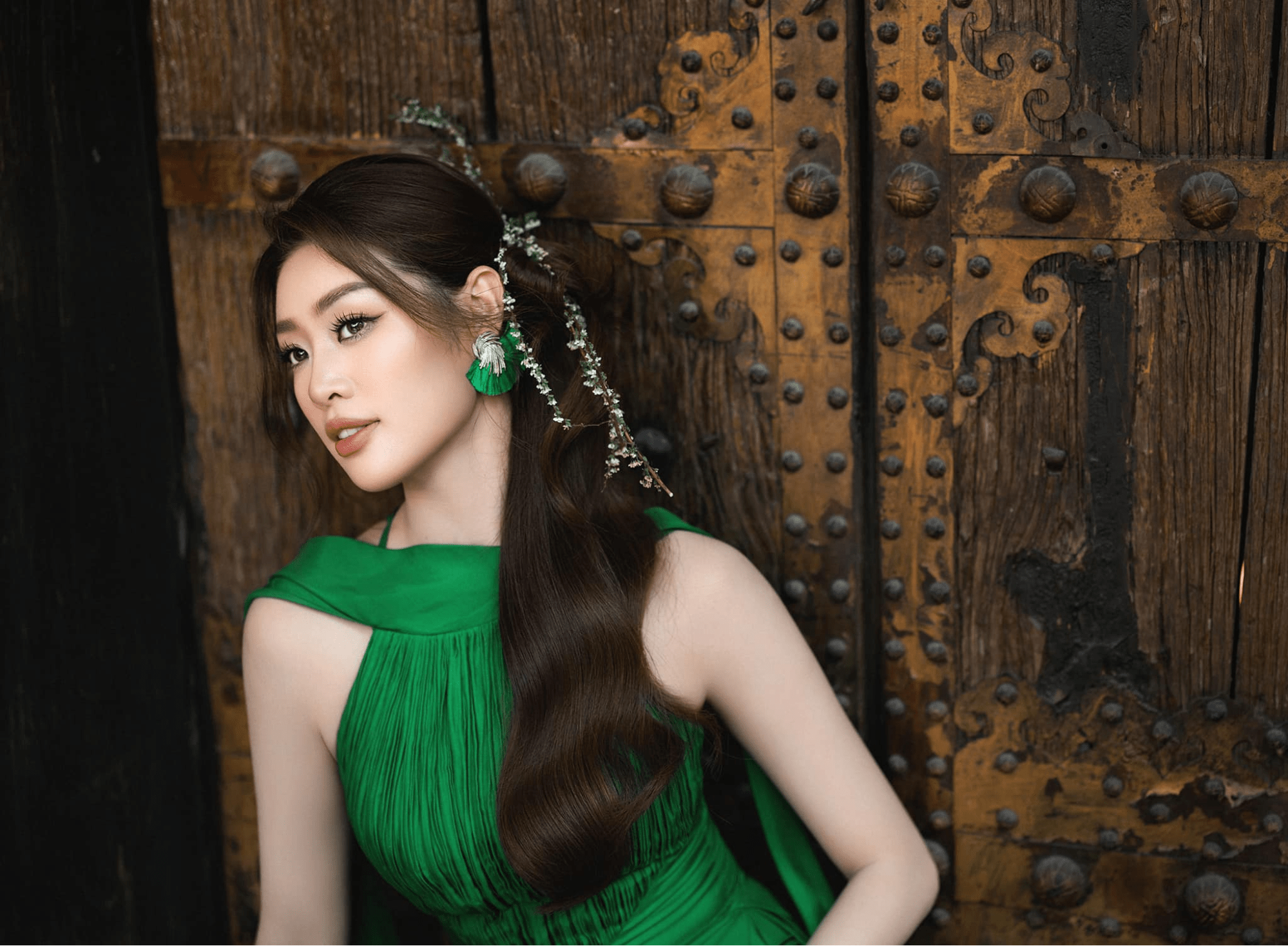 Hoa hậu Khánh Vân khoe khéo nhan sắc tươi mới, rạng rỡ khi diện tà áo dài mang màu xanh lá cây bắt mắt. Thiết kế này được làm theo form dáng hiện đại, phần cổ lấy cảm hứng từ áo tứ thân. Không những vậy, chiếc áo dài của Hoa hậu Khánh Vân còn được tạo điểm nhấn bằng đường vân xếp ly, dập nổi ở ngực và chi tiết xẻ tà cao.