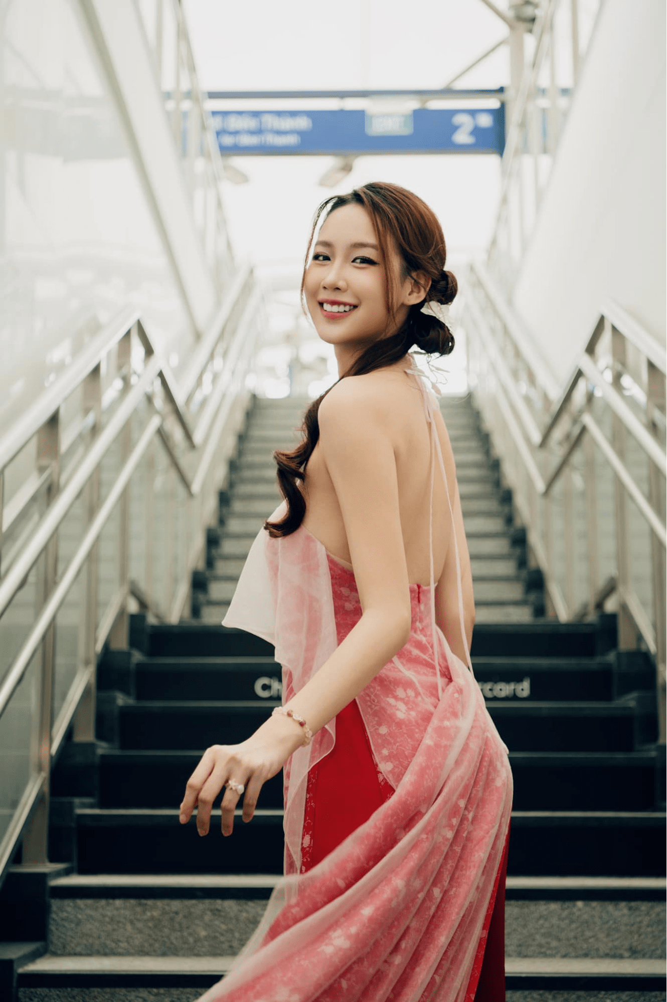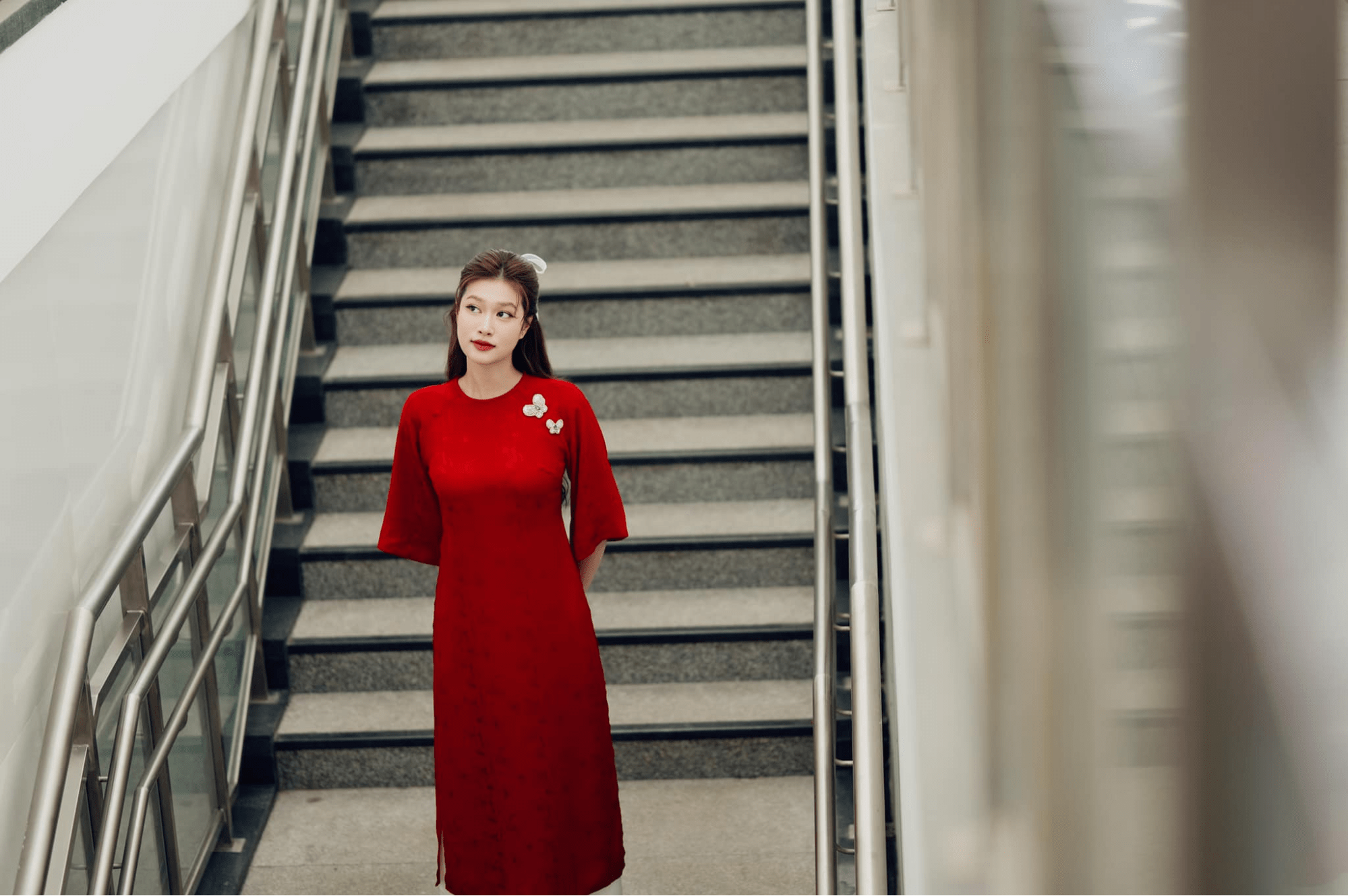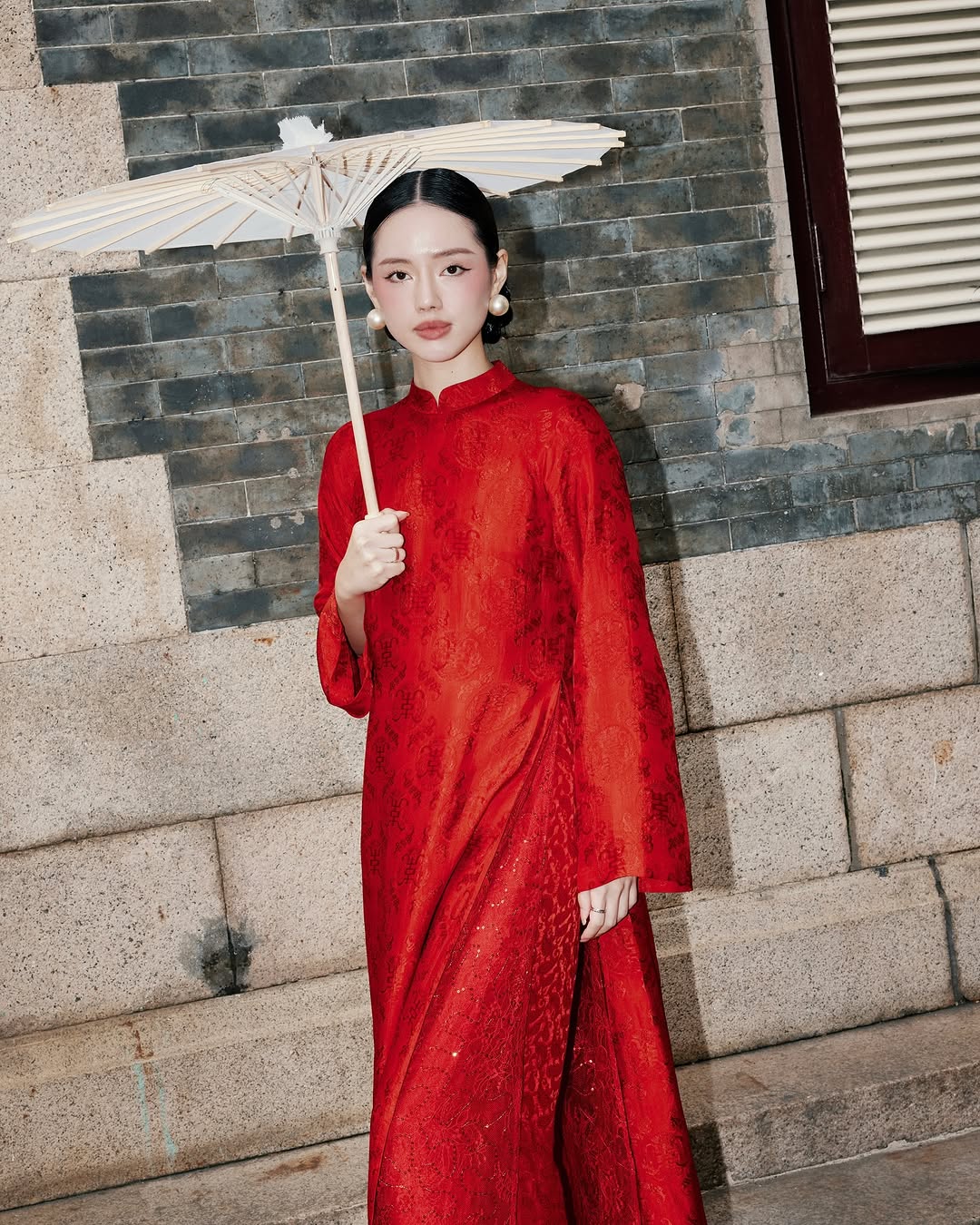 Khánh Linh (Cô Em Trendy) khoác lên mình tà áo dài đỏ rực, sắc màu gợi lên vẻ đẹp quyền lực và may mắn trong văn hóa phương Đông. Thiết kế với họa tiết chìm tinh tế kết hợp cùng chất liệu xuyên thấu nhẹ, tạo nên sự cân bằng giữa truyền thống và hiện đại. Phụ kiện bông tai ngọc trai cỡ lớn và chiếc dù giấy dầu càng làm nổi bật phong thái sang trọng, kiêu kỳ, mang đậm dấu ấn của những quý cô xưa nhưng vẫn đầy hơi thở đương đại.