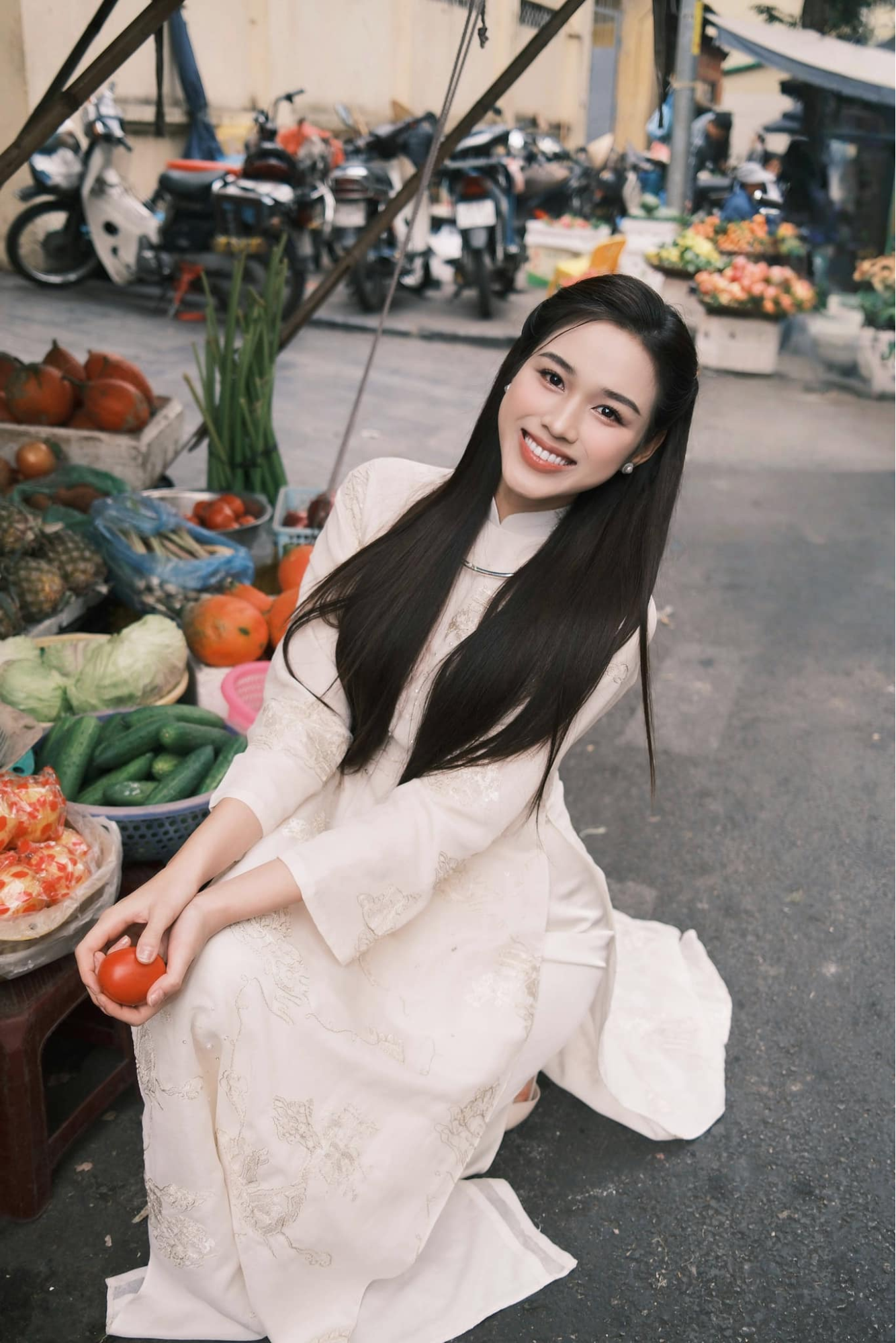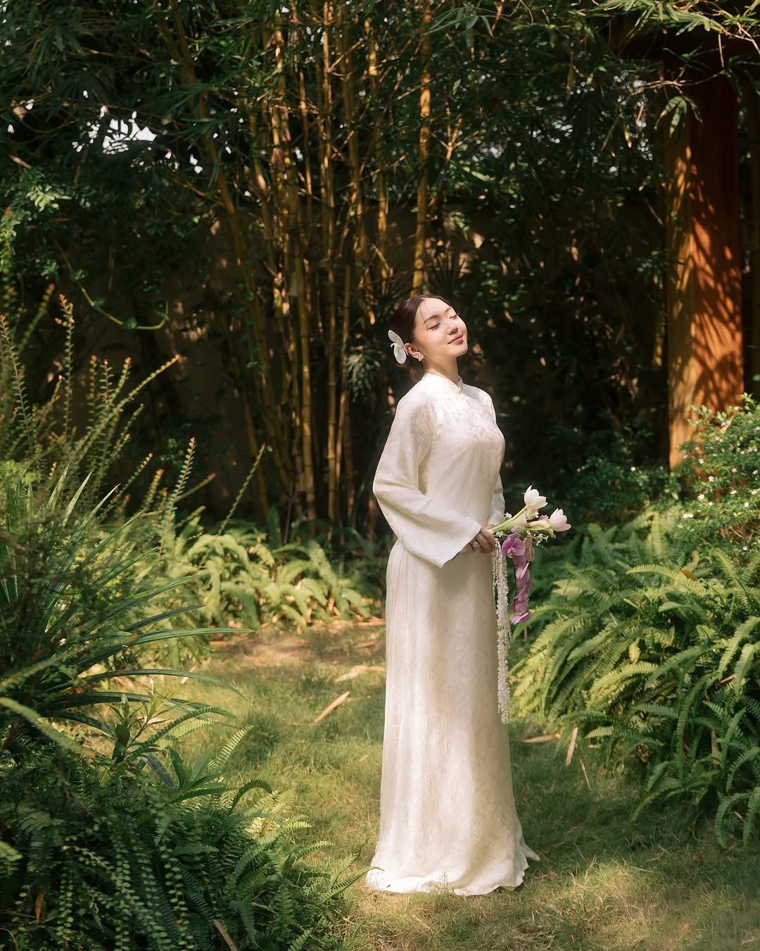 Chloe Nguyễn hóa nàng thơ trong thiết kế áo dài trắng tinh khôi, hòa mình vào không gian thiên nhiên đầy thơ mộng. Chất liệu ren nhẹ nhàng cùng phom dáng truyền thống tôn lên nét thanh lịch, tinh tế, trong khi phụ kiện hoa cài tóc và bó hoa sen trắng mang đến vẻ đẹp dịu dàng, thuần khiết. Hình ảnh gợi nhắc đến vẻ đẹp Á Đông trong trẻo, vừa hoài niệm vừa hiện đại – một lựa chọn hoàn hảo cho những ngày đầu xuân.