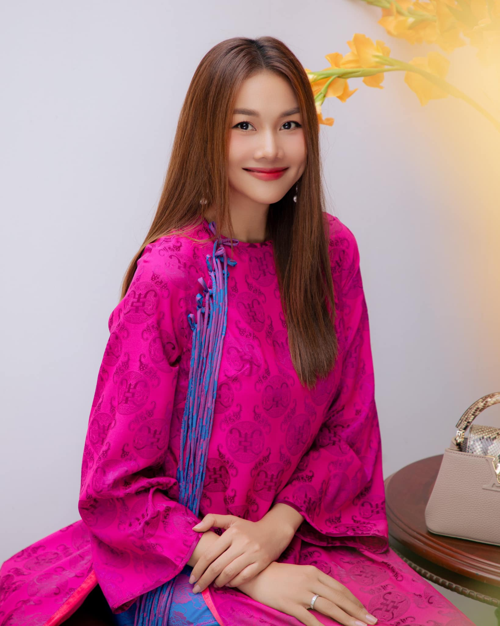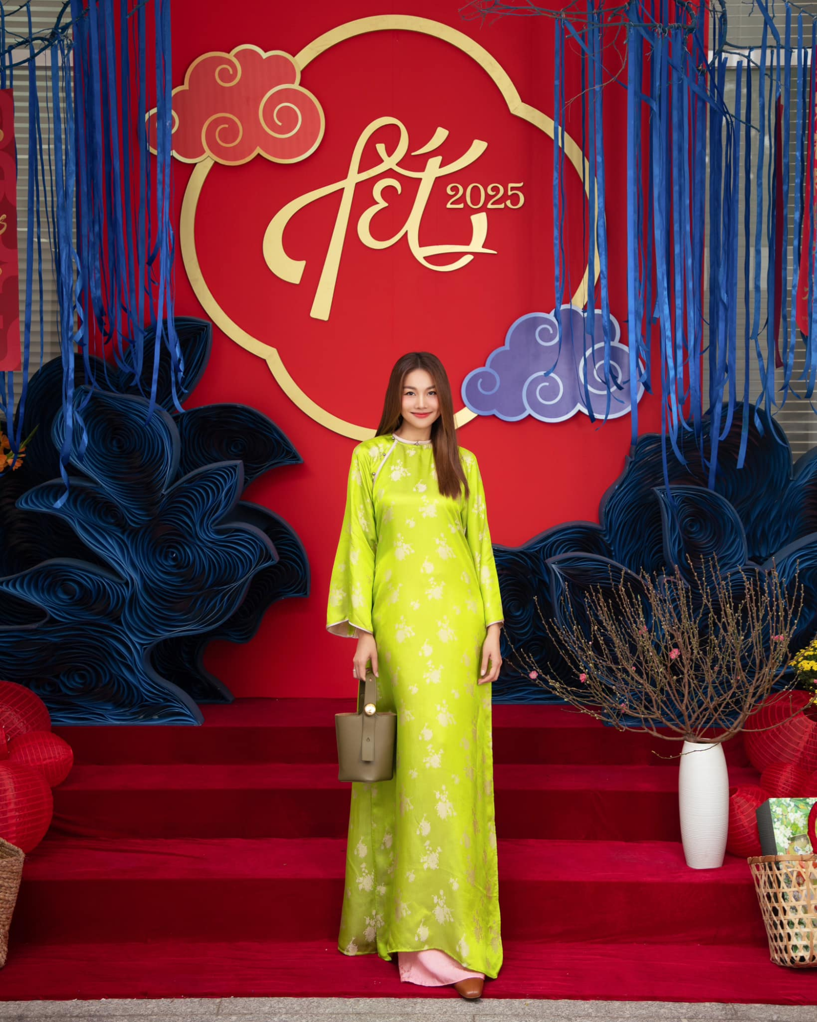 Siêu mẫu Thanh Hằng mang đến hình ảnh vừa truyền thống vừa hiện đại trong những thiết kế áo dài tinh tế ngày Tết. Với ba gam màu chủ đạo – xanh lá, hồng fuchsia và xanh navy – mỗi bộ trang phục đều thể hiện một phong cách khác biệt nhưng vẫn giữ được nét duyên dáng vốn có của áo dài.