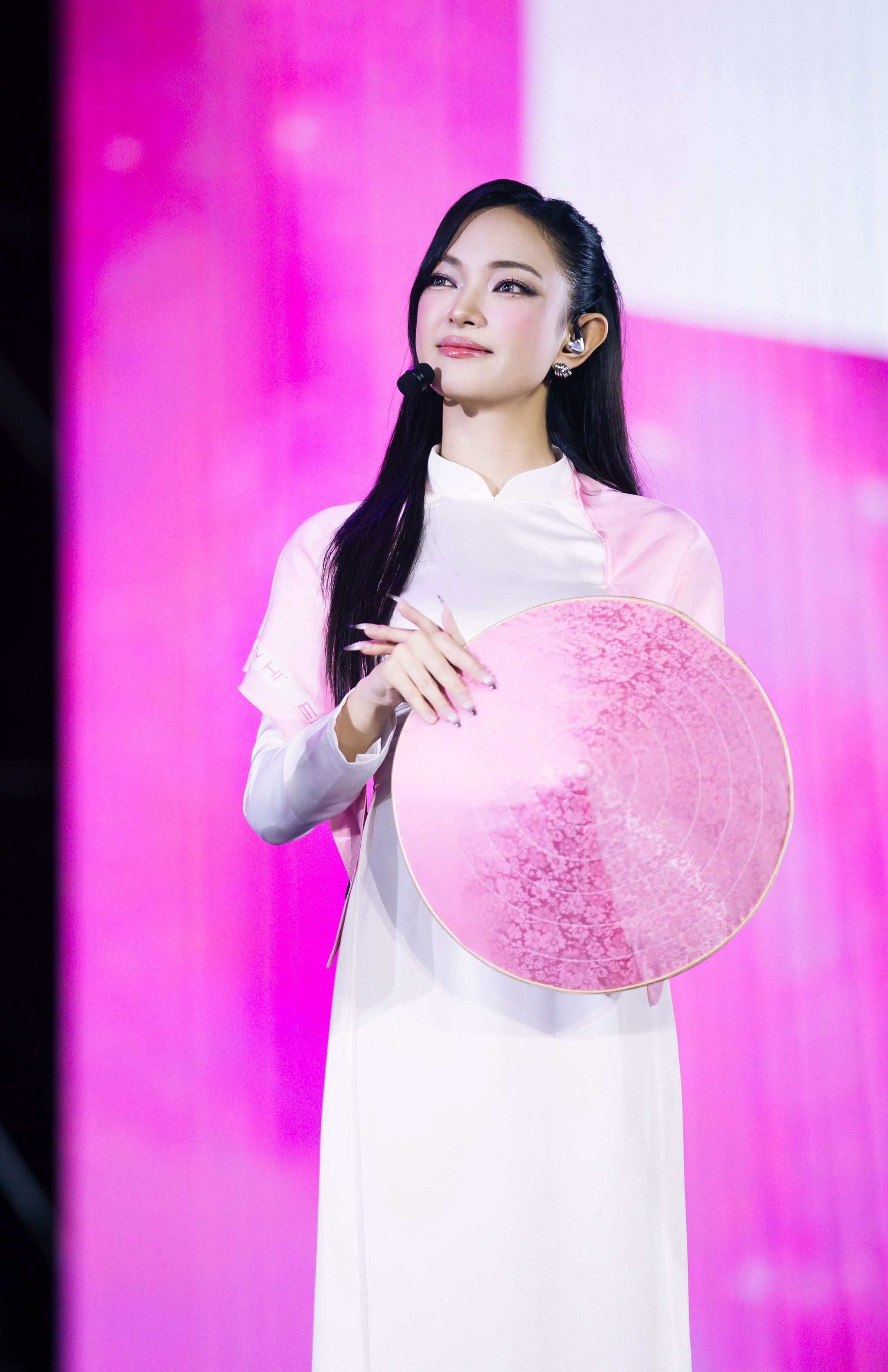 Mở màn với “Việt Nam Hơn Từng Ngày”, Châu Bùi xuất hiện trong tà áo dài truyền thống, nhẹ nhàng và đầy cảm xúc. Đây là lựa chọn khởi đầu giàu ý nghĩa, mang đến không khí trang trọng và gần gũi, đồng thời khắc họa một hình ảnh nữ tính, dịu dàng của cô.