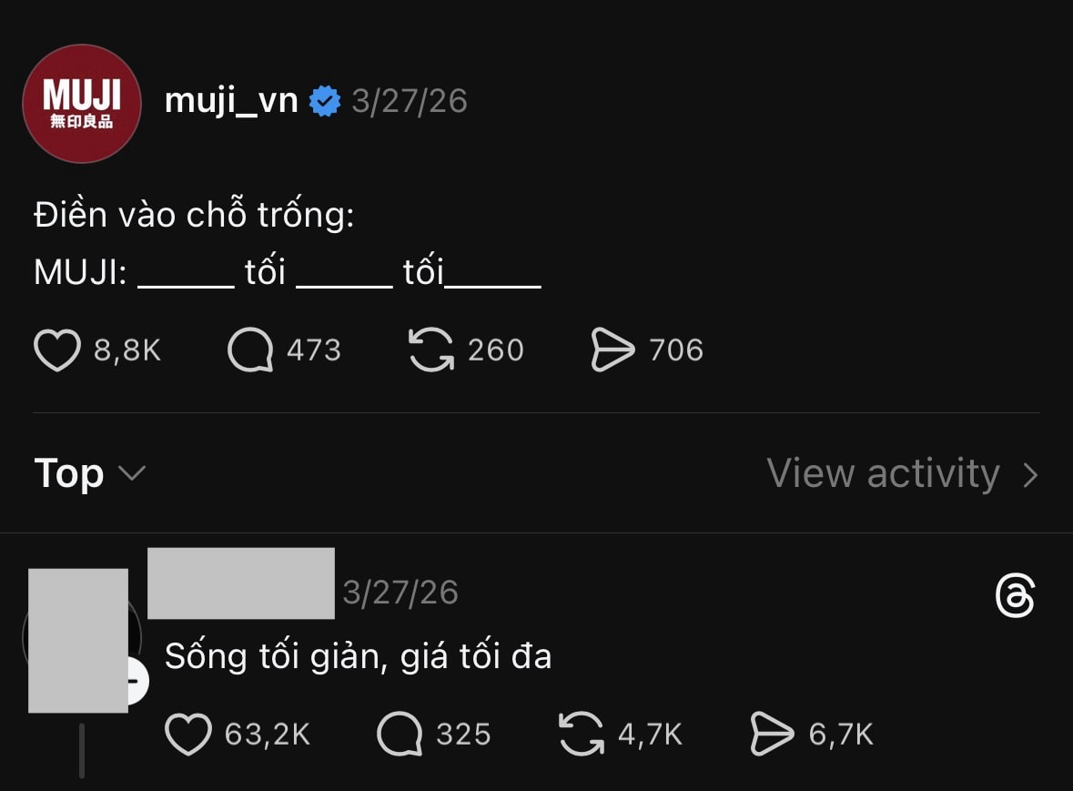 Cũng trong tháng 3, MUJI Việt Nam lại rơi vào một tình huống khác khi bắt trend điền vào chỗ trống trên Threads với câu “MUJI: _____ tối _____ tối_____”. Thương hiệu kỳ vọng người dùng hoàn thiện thông điệp “Sống tối giản, giá tối ưu”, nhưng comment lan tỏa mạnh nhất lại là “Sống tối giản, giá tối đa”. Sự chênh lệch rõ ràng giữa định hướng truyền thông và cách người dùng diễn giải cho thấy một vấn đề sâu hơn về nhận thức thương hiệu trong mắt người tiêu dùng. Thậm chí, bài chia sẻ của MUJI chỉ nhận được hơn 8 nghìn lượt yêu thích, trong khi comment của khách hàng lại nhận về tận hơn 63 nghìn lượt tương tác và rất nhiều ủng hộ viral mạnh mẽ trên các trang mạng xã hội.