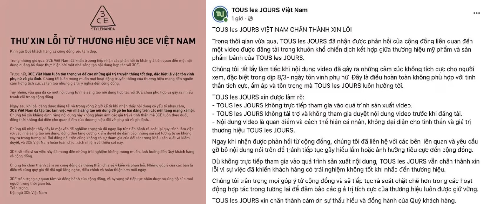 Ở góc độ của 3CE Việt Nam và TOUS les JOURS Việt Nam, việc biến bạo lực gia đình thành chi tiết gây cười cho thấy một lệch chuẩn nghiêm trọng trong cách xây dựng nội dung. Bạo lực chưa bao giờ là một hành vi có thể được bình thường hóa, càng không phải chất liệu để tạo ra tiếng cười. Vì vậy khi bị đưa vào quảng cáo như một công cụ gây chú ý, cảm giác mà video đó tạo ra không phải là giải trí mà là sự xúc phạm. Trong bối cảnh xã hội đang nỗ lực nâng cao nhận thức về quyền phụ nữ, việc ví dấu vết bạo lực như một cách tạo má hồng không chỉ phản cảm mà còn cho thấy sự hời hợt trong nhận thức, từ đó vô tình gửi đi thông điệp sai lệch trên mạng xã hội.