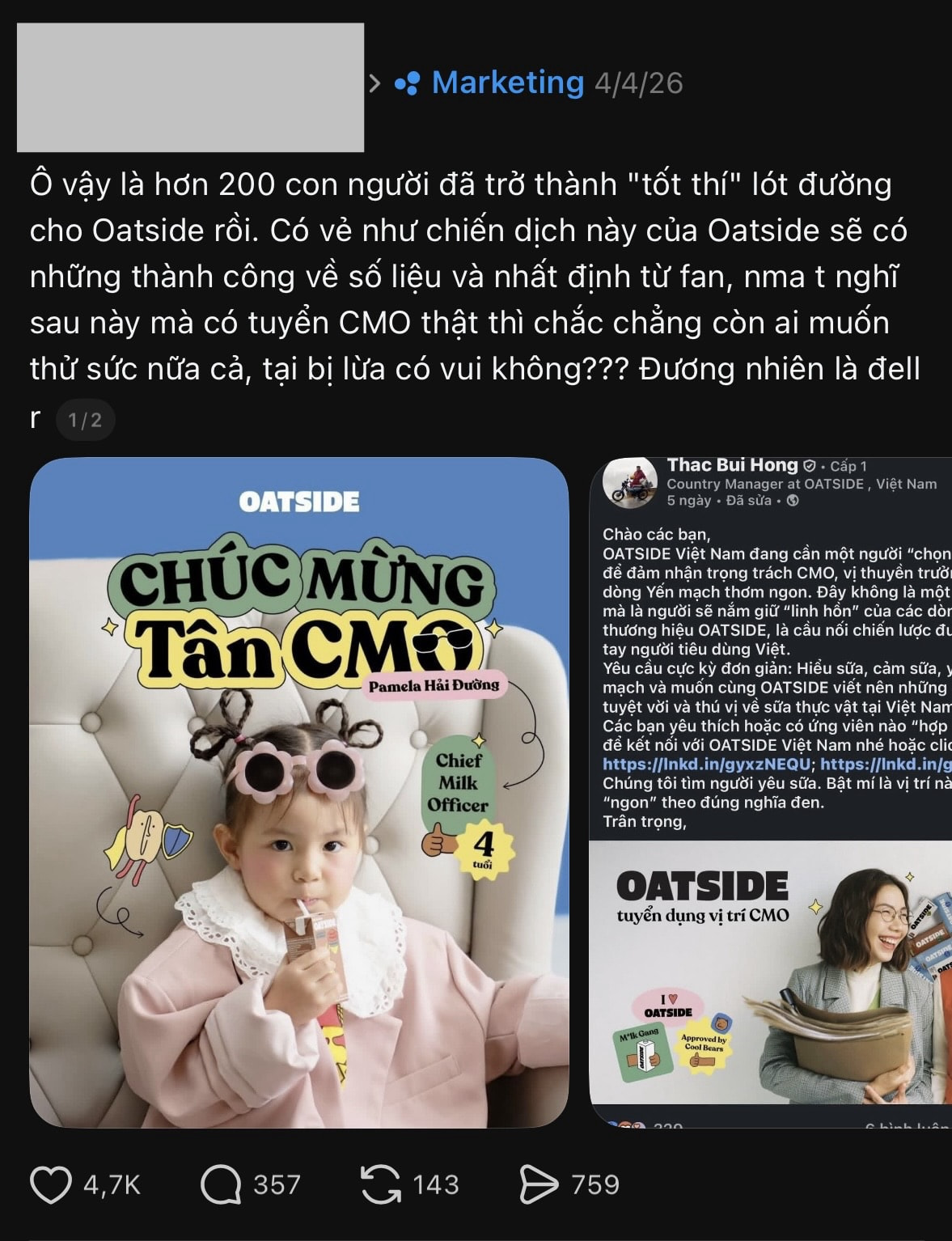 Trường hợp của OATSIDE gần đây cũng tiếp tục cho thấy rủi ro khi sử dụng yếu tố bất ngờ mà không cân nhắc đến bối cảnh cũng như thị trường tuyển dụng đầy nhạy cảm hiện nay. Tin tuyển dụng vị trí Chief Marketing Officer của hãng trên LinkedIn nhanh chóng thu hút hơn 200 hồ sơ chỉ trong hai ngày, phản ánh nhu cầu và sự quan tâm nghiêm túc từ cộng đồng. Tuy nhiên, việc biến toàn bộ quá trình này thành bước đệm cho màn công bố đại sứ thương hiệu với danh xưng Chief Milk Officer đã tạo ra cảm giác bị đánh lừa, khiến thương hiệu phải nhanh chóng lên tiếng xin lỗi vì sự thiếu thận trọng trong cách làm việc của mình. Cái giá phải trả cho vài ngày rầm rộ trên mạng xã hội thậm chí có thể là sự quay lưng âm thầm từ giới trí thức và các chuyên gia đầu ngành, những người vốn có sức ảnh hưởng tự nhiên đến uy tín của thương hiệu về lâu dài.