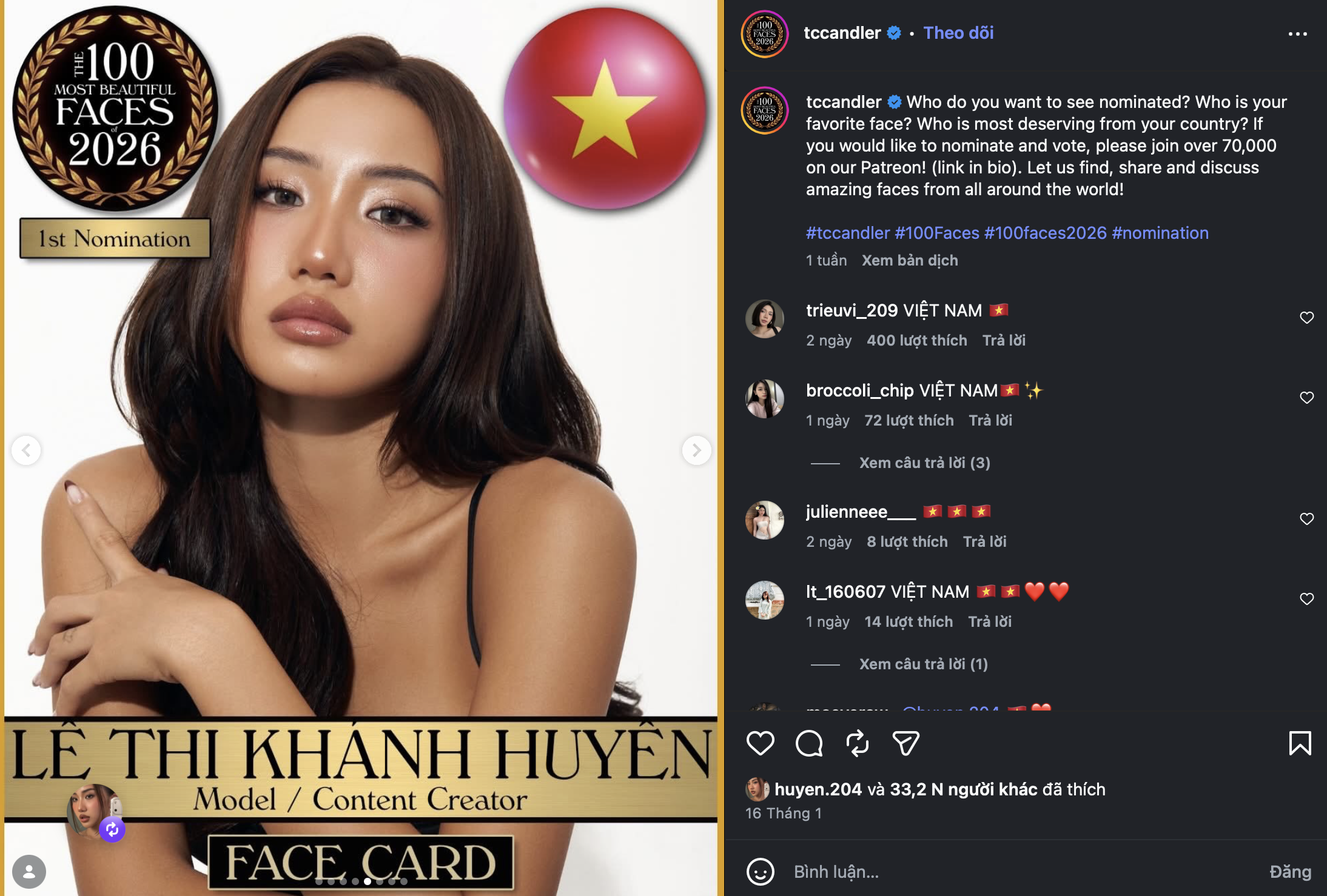 Việc Lê Thị Khánh Huyền xuất hiện trong danh sách đề cử 100 gương mặt đẹp nhất thế giới 2026 do TC Candler công bố có thể xem là một dấu mốc đáng chú ý nếu đặt trong bối cảnh thị trường Influencer Việt Nam đang ngày càng tiệm cận sân chơi quốc tế. TC Candler vốn là cái tên quen thuộc với công chúng toàn cầu nhờ các bảng xếp hạng sắc đẹp mang tính lan tỏa mạnh trên mạng xã hội.